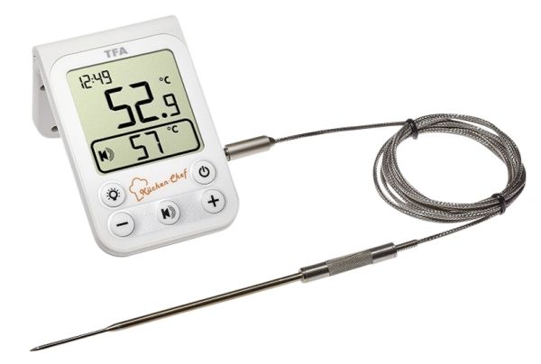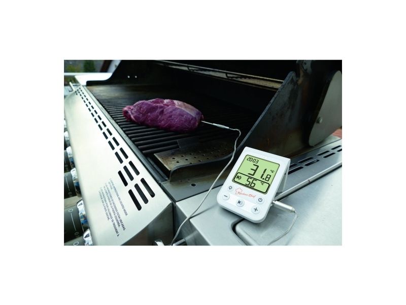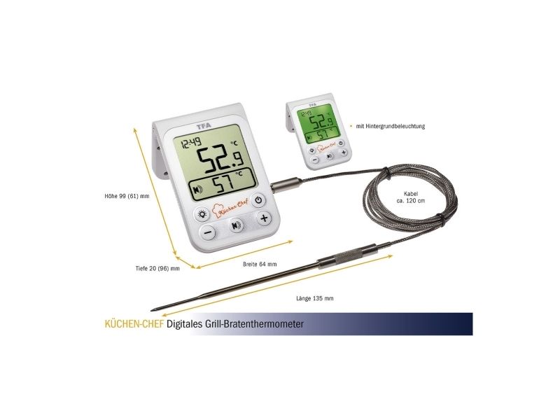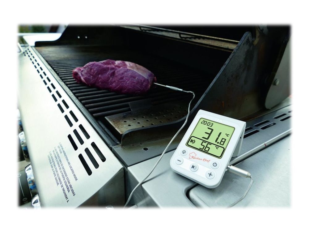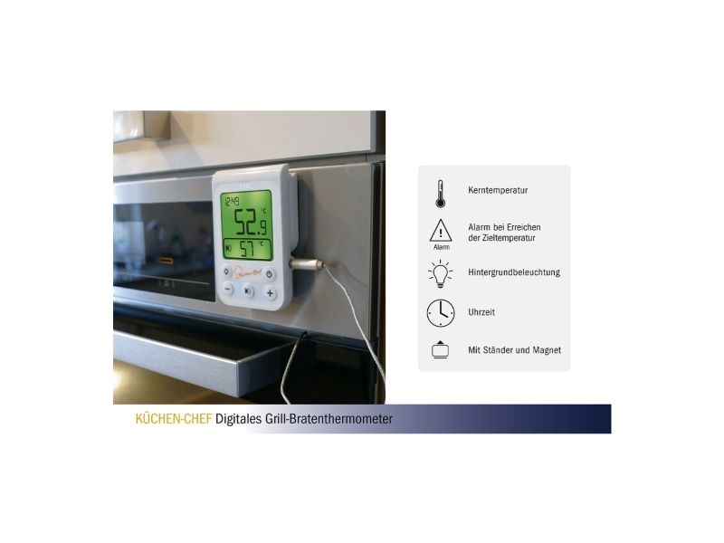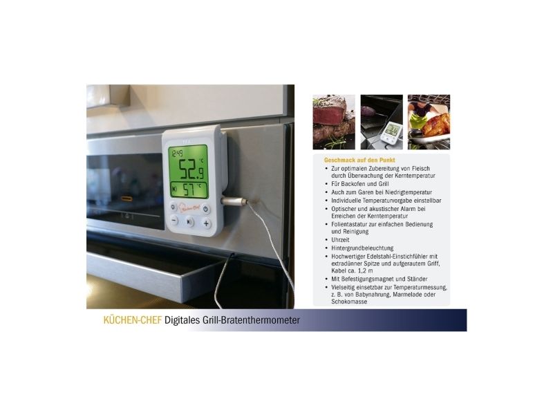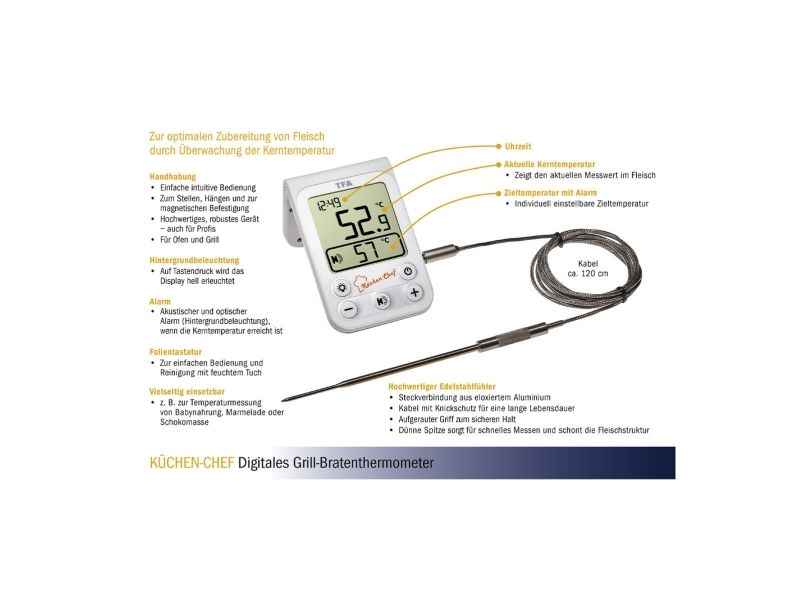 Roasting and barbecuing meat to perfection - by monitoring the core temperature! Cook like a professional with 100% guarantee of success. This is because the digital BBQ-roast thermometer "KÜCHEN-CHEF" reliably informs you with a beep when the desired core temperature is reached. This ensures that you always have the ideal doneness - whether you prefer your meat rare, medium or well done. The high-quality stainless steel penetration probe can remain in the oven or grill during the whole cooking process. Simply insert the probe into the meat and lead the heat-resistant cable out of the oven. The extra-thin probe tip ensures fast measurement and protects the meat structure. Place or hang the device near the oven. The thermometer is easy to use and very easy to read thanks to the brightly illuminated display. The "KÜCHEN-CHEF" is ideal even for cooking at low temperatures. This versatile device can also be used for other applications in food preparation, e.g. for the temperature control of baby food, jam making or chocolate mass.