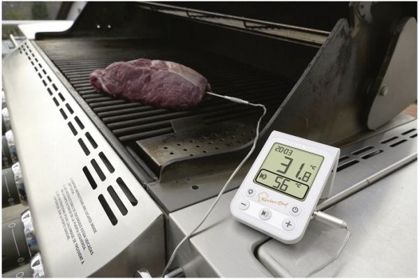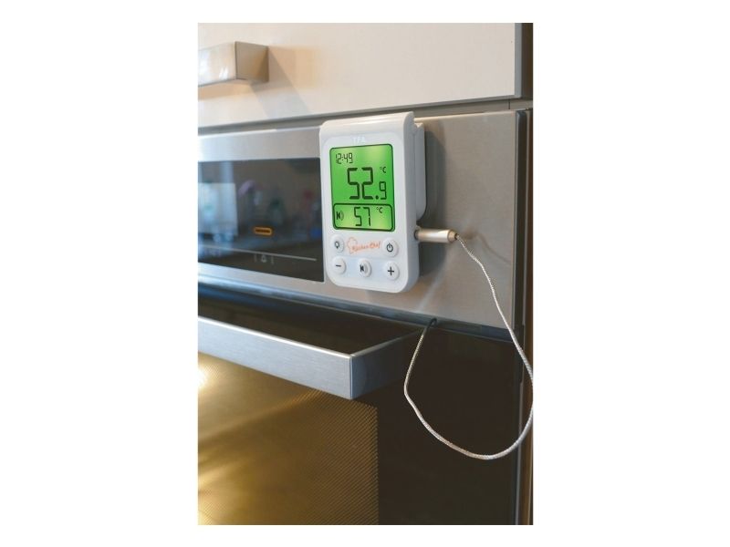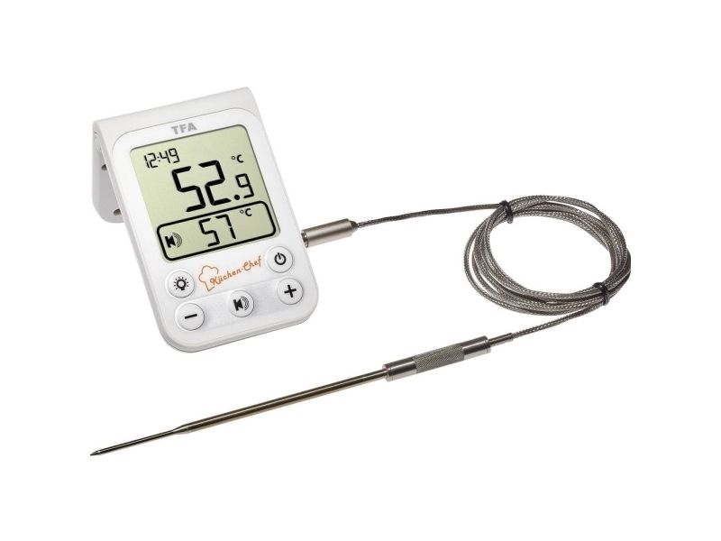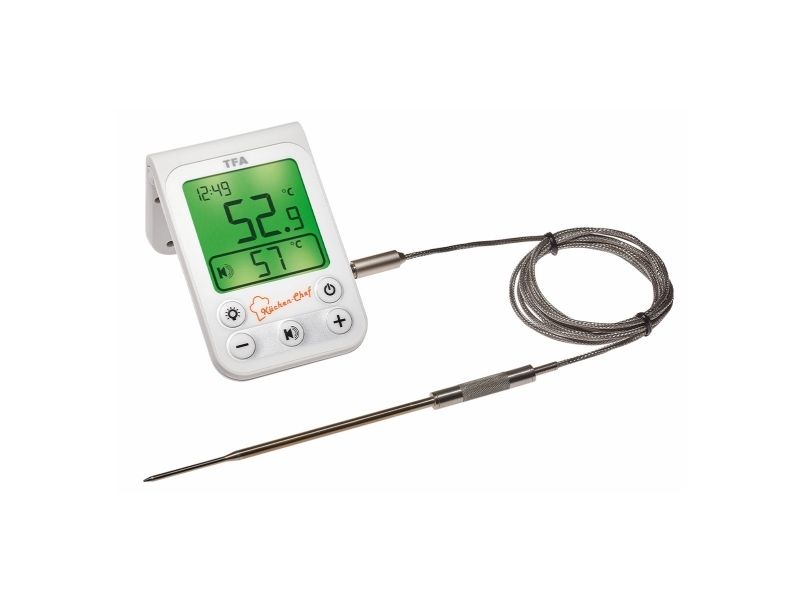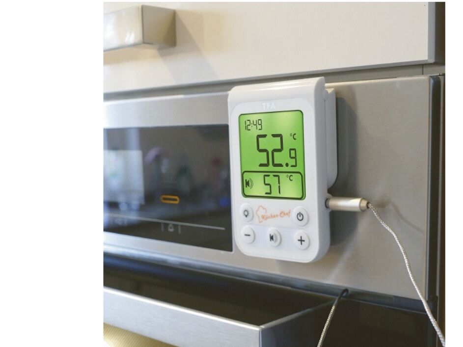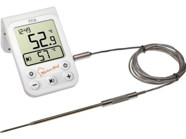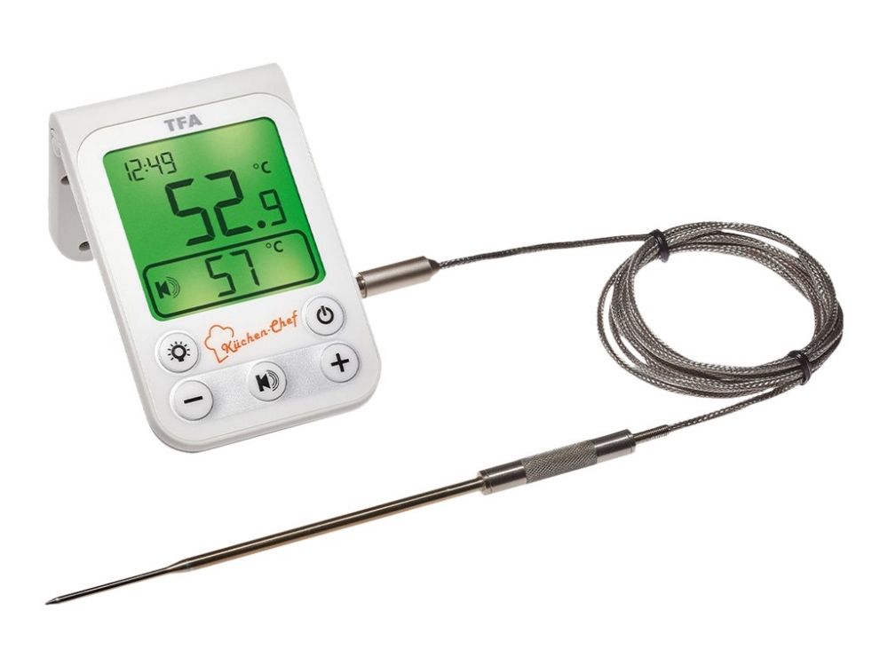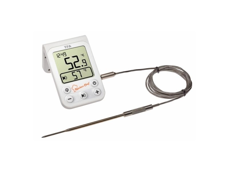 Roasting and barbecuing meat to perfection - by monitoring the core temperature! Cook like a professional with 100% guarantee of success. This is because the digital BBQ-roast thermometer "KÜCHEN-CHEF" reliably informs you with a beep when the desired core temperature is reached. This ensures that you always have the ideal doneness - whether you prefer your meat rare, medium or well done. The high-quality stainless steel penetration probe can remain in the oven or grill during the whole cooking process. Simply insert the probe into the meat and lead the heat-resistant cable out of the oven. The extra-thin probe tip ensures fast measurement and protects the meat structure. Place or hang the device near the oven. The thermometer is easy to use and very easy to read thanks to the brightly illuminated display. The "KÜCHEN-CHEF" is ideal even for cooking at low temperatures. This versatile device can also be used for other applications in food preparation, e.g. for the temperature control of baby food, jam making or chocolate mass.