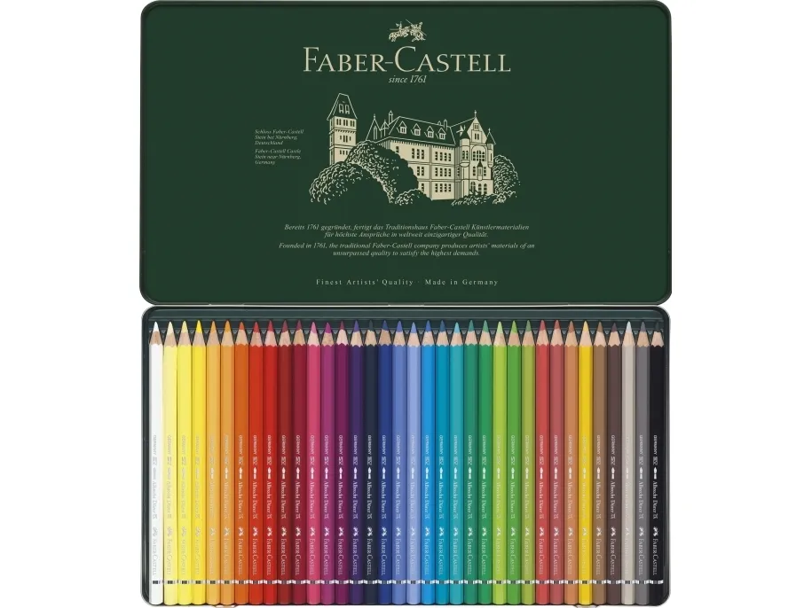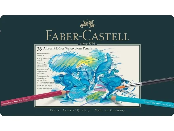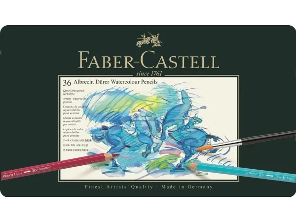 Albrecht Dürer artists' watercolour pencils provide artists with great versatility of expression when drawing, shading and painting in watercolours. High-quality materials, combined with over 250 years of experience, have resulted in watercolour pencils that produce unsurpassed watercolour effects and vibrancy. The coloured surface can be transformed with only a few fine or broad brush strokes to reveal the full and unique power of the colours. Depending on the paper being used, the pigments can be completely dissolved, and will then behave in the same way as classic watercolour paints. The paint becomes permanent when dry, enabling other layers of colour to be superimposed without causing it to dissolve again.\n- High quality pigments of unsurpassed light-fastness and brilliance\n- Pigments dissolve completely when brushed with water\n- Smooth colour stroke\n- Break-resistant due to special bonding process\n- 36 colours in a metal tin\n- Available as individual pencils or in various assorted sets