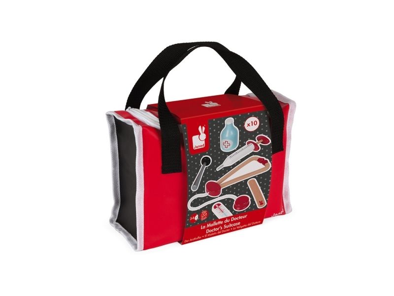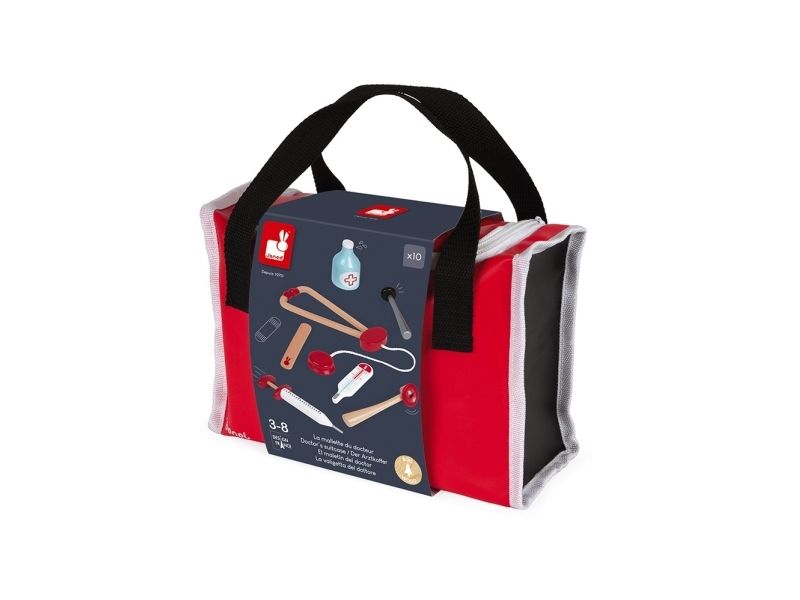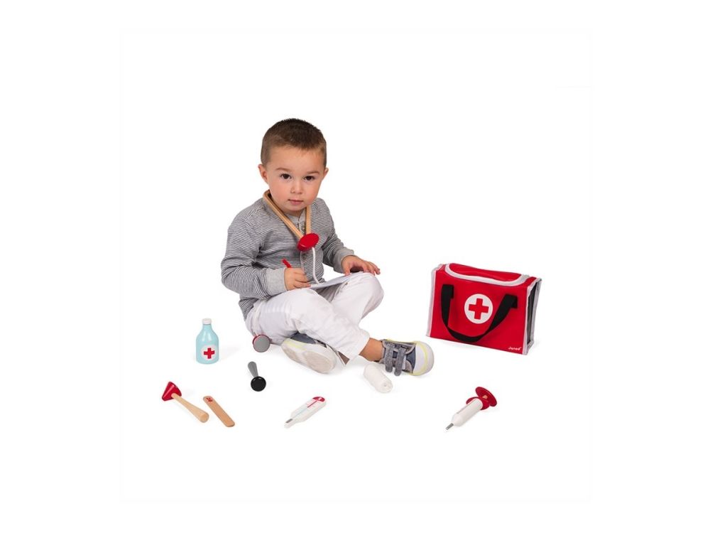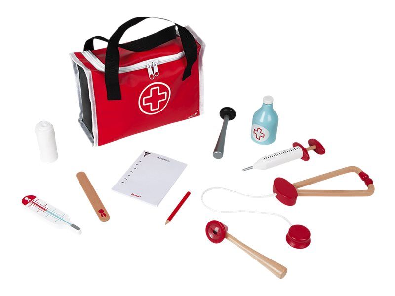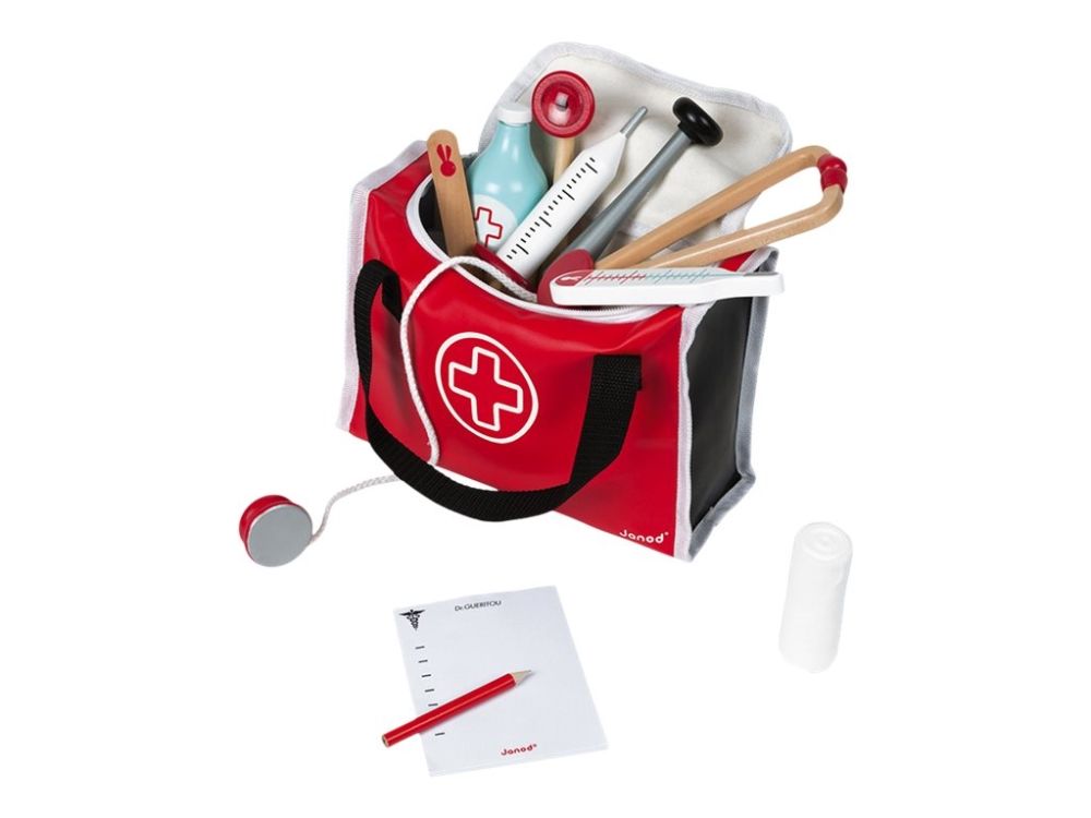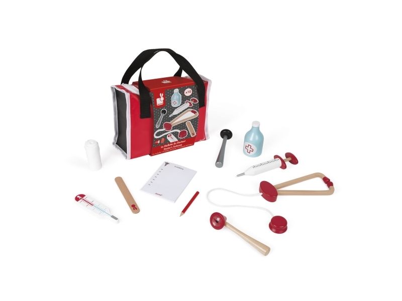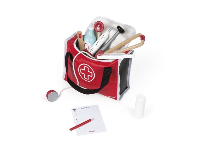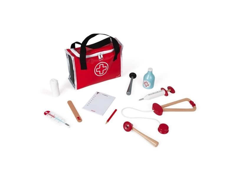 10 accessories in solid wood: a syringe fitted with an inner spring, a reflex hammer, a bottle of disinfectant, a stethoscope, an otoscope equipped with a magnifying glass, a thermometer, a tongue depressor, a prescription pad (30 pages) with a paper pencil, a bandage roll.