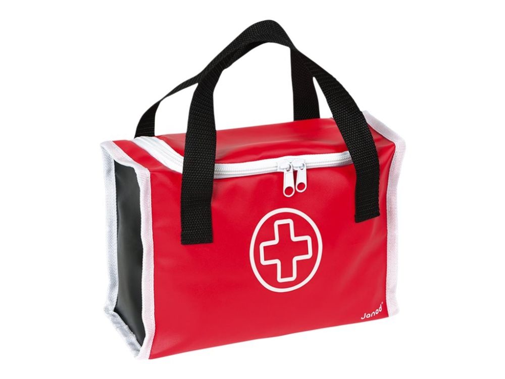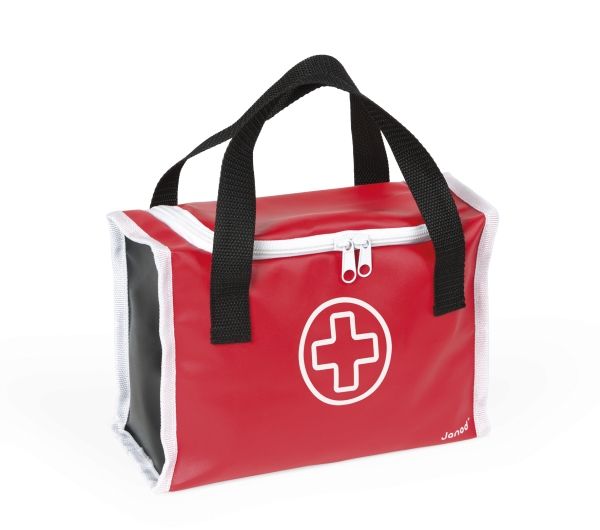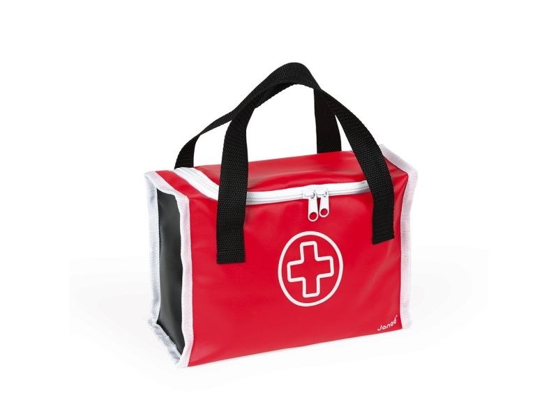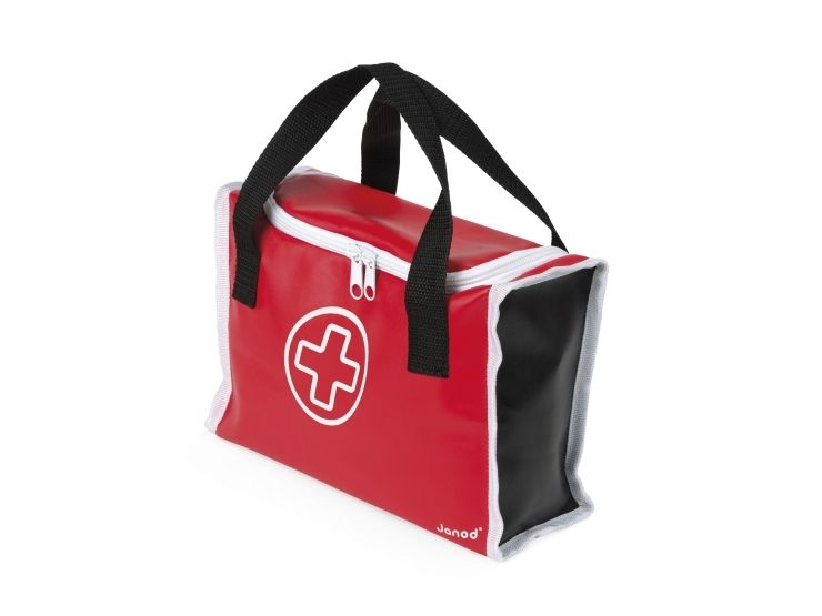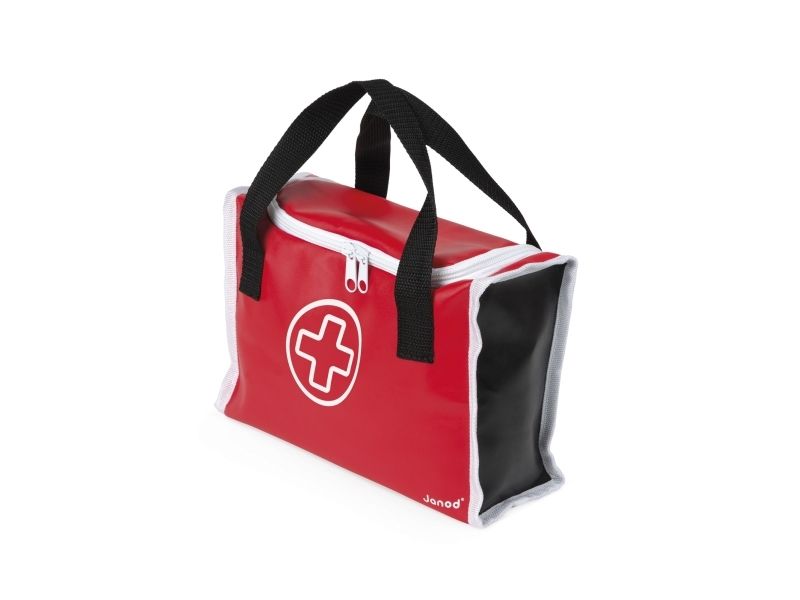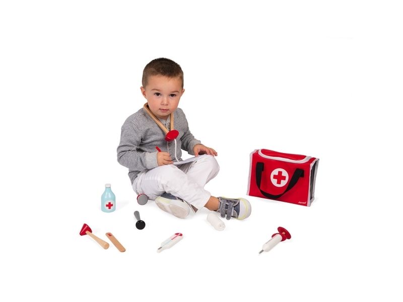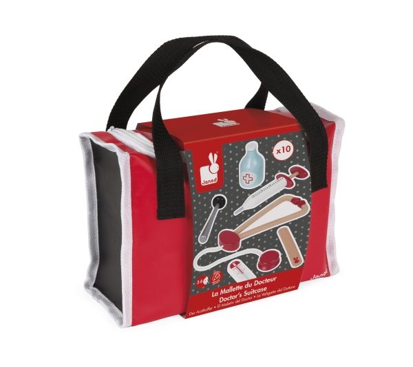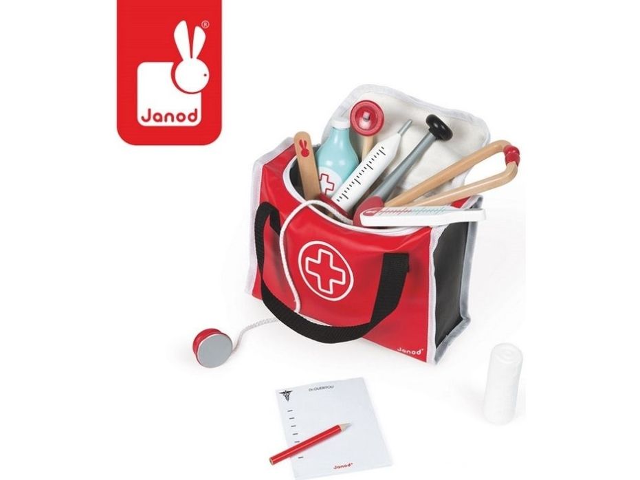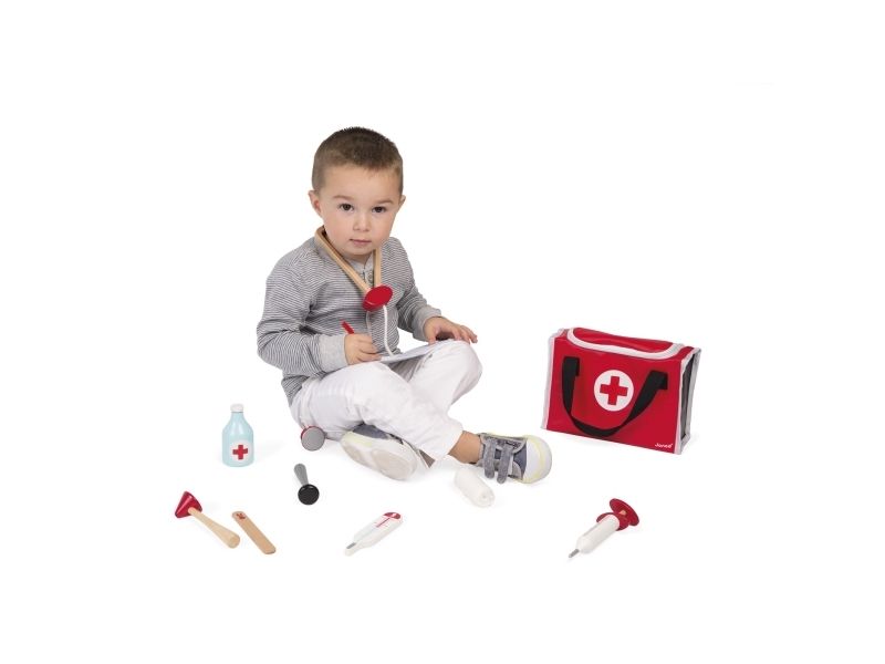 10 accessories in solid wood: a syringe fitted with an inner spring, a reflex hammer, a bottle of disinfectant, a stethoscope, an otoscope equipped with a magnifying glass, a thermometer, a tongue depressor, a prescription pad (30 pages) with a paper pencil, a bandage roll.