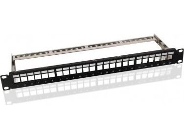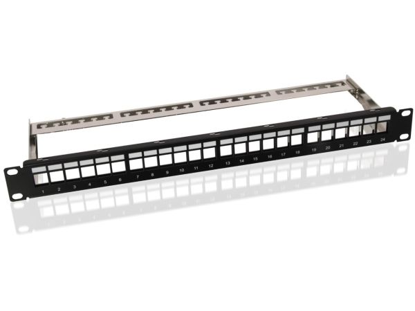- 24 Port Panel zur Aufnahme von Keystone Jacks SNAP-IN - Beschriftungsfeld - Montagematerial & Schrauben im Lieferumfang - für 19 Zoll Montage geeignet - Bauform: 24x RJ 45 - Farbe: schwarz - Schirmungsmaß: ungeschirmt