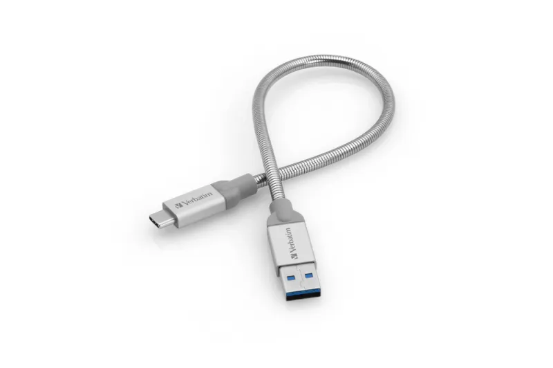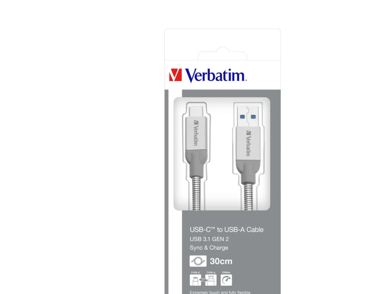 Verbatim Sync & Charge cables allow you to charge your device and transfer data in one single cable.The USB-C to USB-A cable allows you to connect devices that use a USB Type-C interface to Notebook/ PC''s with Type-A interfaces. E.g. Nokia N1 Tablet (Type-C) or Windows Lumia 950 Smartphone (Type-C) to a Notebook/laptop (Type-A). The flexible stainless steel cable prevents wear and breakage and allows coiling for easy storage. Verbatim USB-C to USB-A Stainless Steel Sync & Charge Cable USB 3.1 GEN 2 30cm. Cable length: 0.3 m, Connector 1: USB B, Connector 2: USB A, USB version: USB 3.2 Gen 2 (3.1 Gen 2), Maximum data transfer rate: 10000 Mbit/s, Product colour: Silver