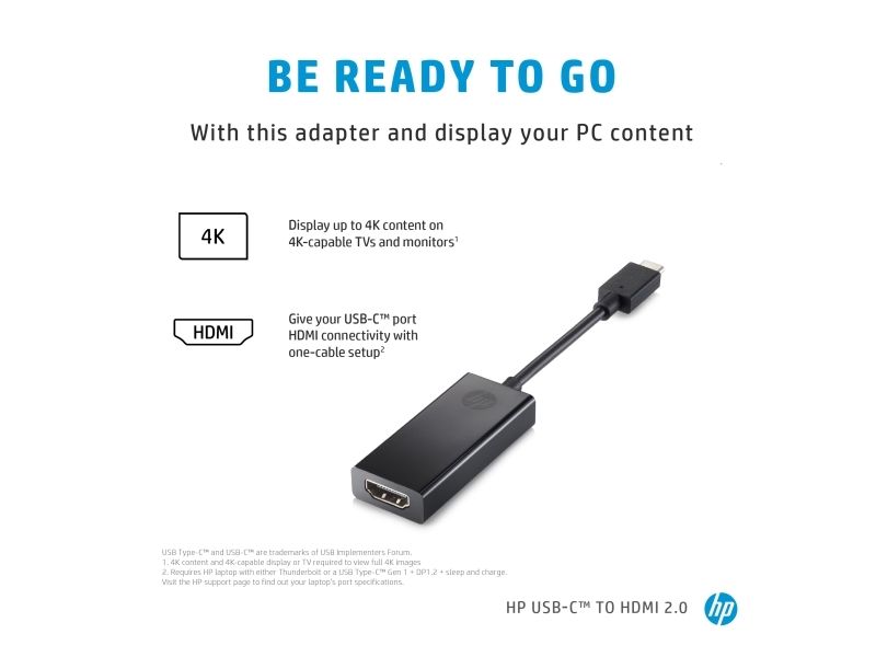 - Anzeige auf einem Monitor, einem Projektor oder einem Fernsehgerät über den HDMI-Anschluss. - Anzeigen von bis zu 4K-Inhalten auf 4K-fähigen Fernsehgeräten und Monitoren. - Leicht zu transportierender Adapter, um Ihre PC-Inhalte an jedem Ort anzeigen zu können. - HP USB-C™-fähige PCs.