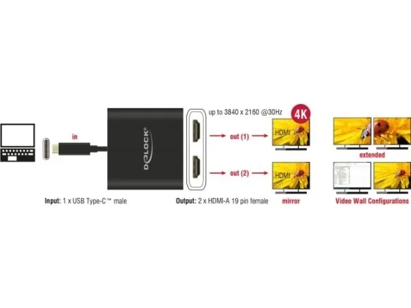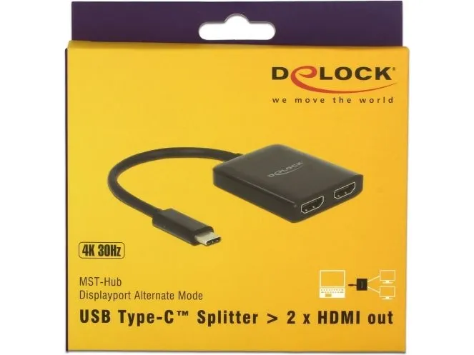 This splitter by Delock is suitable for the connection of two HDMI monitors to a computer with USB-C interface and Displayport alternate mode support. Two monitors can be operated simultaneously at the outputs.