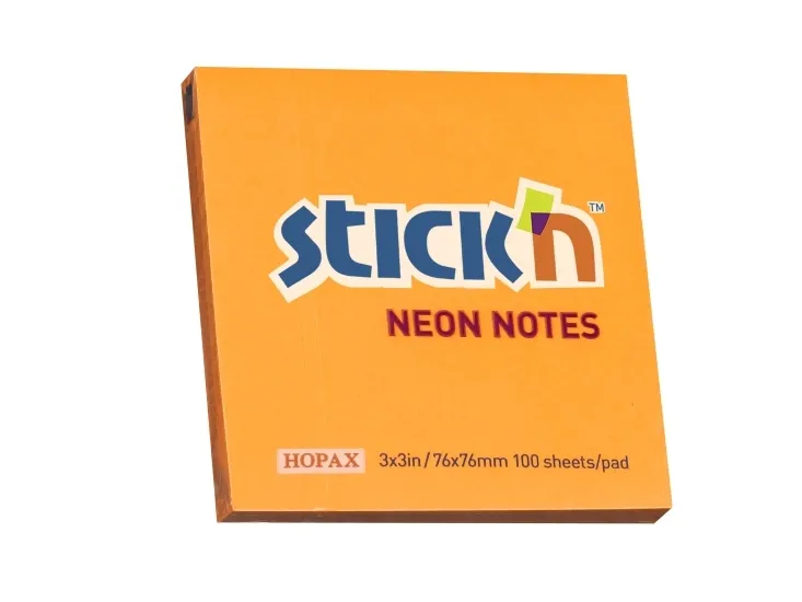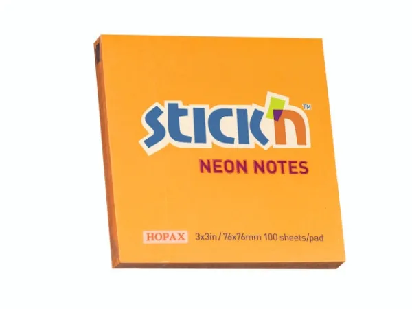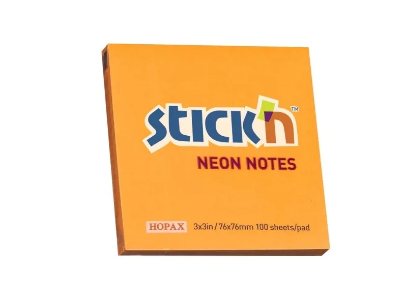 Selbstklebender Notes Stick'N in Neonorange, der immer wieder klebt, ohne die Oberfläche zu beschädigen. 100 Blatt 76x76mm.