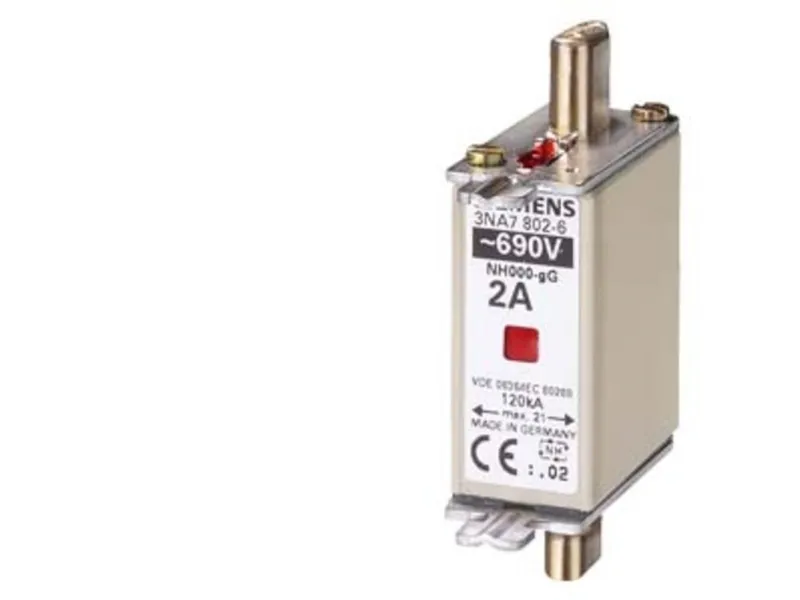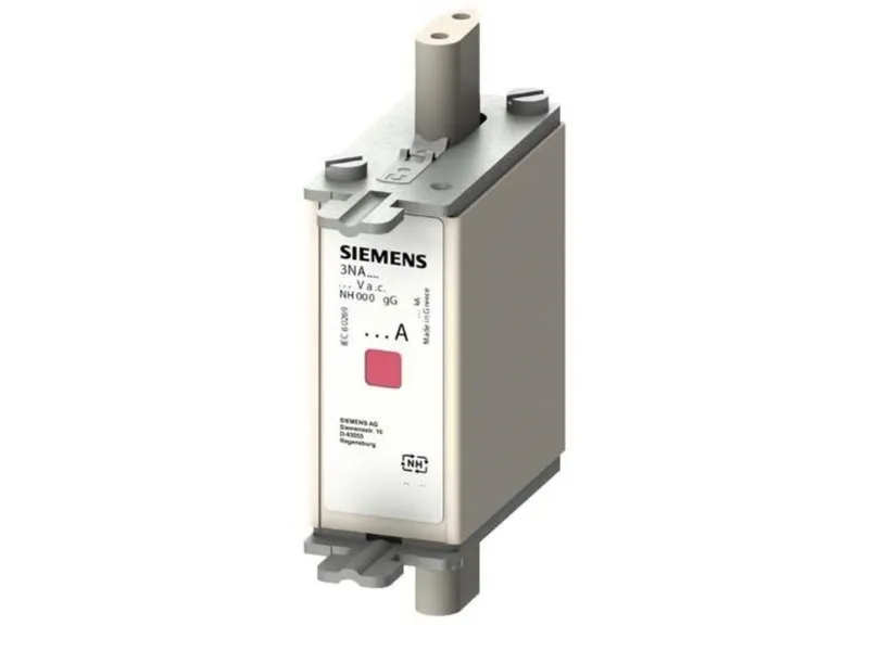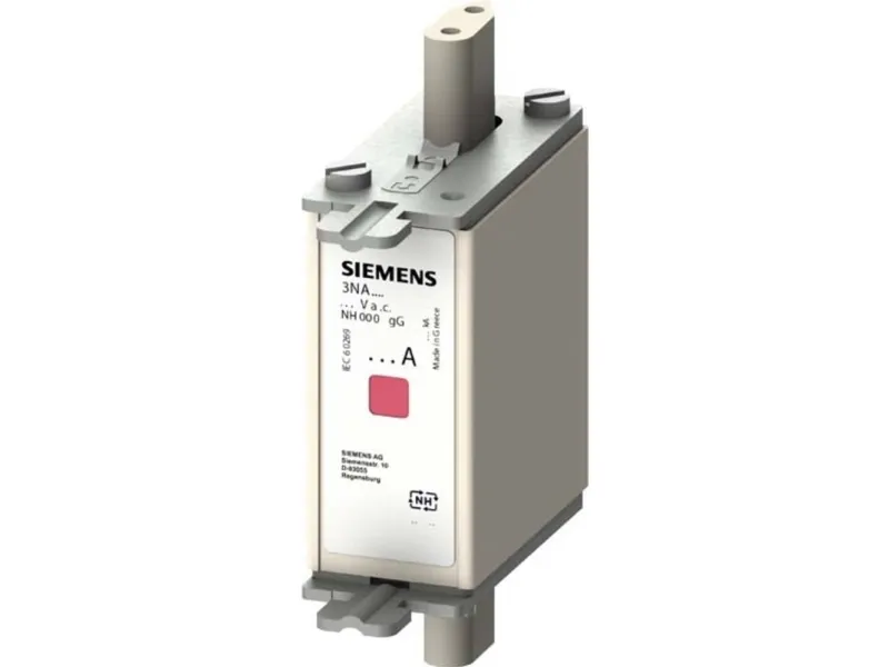 NH-sikringsindsats, NH000, i: 25 A, gG, Un AC: 690 V, Un DC: 250 V, ... NH-sikringsindsats, NH000, i: 25 A, GG, UN AC: 690 V, UN DC: 250 V, kombisensor, spændingsførende NH-sikringssystem 3NA, 3ND til selektiv lednings- og anlægsbeskyttelse. NH-sikringssystemet fra Siemens som vigtig del af SENTRON beskyttelseskomponenter til el-installationer giver effektiv person-, apparat- og anlægsbeskyttelse med sikker frakobling i tilfælde af overbelastning og kortslutning. I sammenligning med ledningsbeskyttelseskontakter kan højere kortslutningsstrømme opnås samtidig med bedre strømbegrænsning. NH-sikringssystemet er især kendetegnet ved: 1. Kombialarmen signalerer, at sikringen slukkes ved hjælp af et tydeligt farveskift, der går fra rød til hvid. 2. Mere sikkerhed ved udskiftning med isolerede gribeflige. 3. Høj selektivitet og lave omkostninger. 4. Langvarig og sikker drift takket være forsølvede kontaktknive. 5. Sikringsindsatser på 2 A til 1250 A og i størrelserne 000, 00, 0, 1, 2 3, 4 og 4a. x