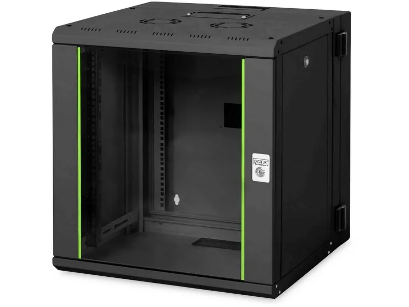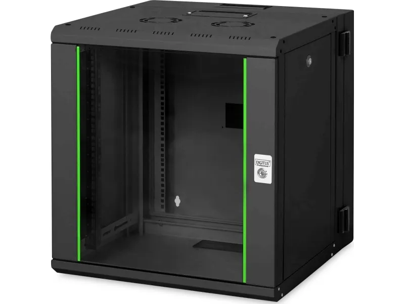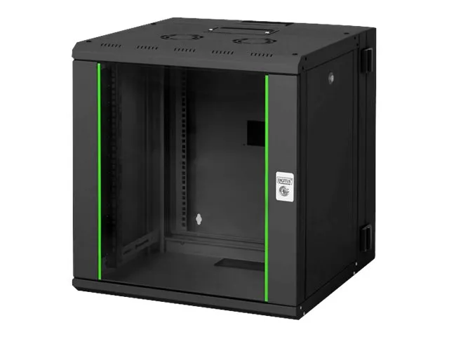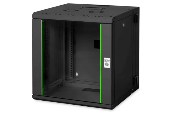The Wall Mounting Cabinets of the Unique Series were designed for the user friendly installation of active- and passive network components accompanied by a neat cable management. Each rack consists of up to 1.5 mm strong steel sheet material which ensures a very good stability as a robust steel construction. The color is created by powder coating in grey (RAL 7035) and black (RAL 9005). Wall installation can be done easily. Separately leveling feet or castors are available for free standing purposes. Door and side panels are easy to detach and the door stop can be changed from right to left. The roof contains air ventilation slots for a better air circulation. Each wall mounting cabinet contains one pair (two pieces) of mounted 483 mm (19") profile rails inside. They are galvanized, with height unit marking (countable from both directions) and variable in depth. Furthermore, the rear frame is outfitted with 483 mm (19") punch outs. An important aspect for each installation is the cable management. The roof of each cabinet is equipped with a sliding cable entry panel with rubber sealing. Punched out cable entries with plastic cover are present on the rear wall and base. The rear frame is also equipped with brushes on top and base side. An extensive portfolio of accessories for cable management, shelves, etc. will help to meet many requirements in daily use.