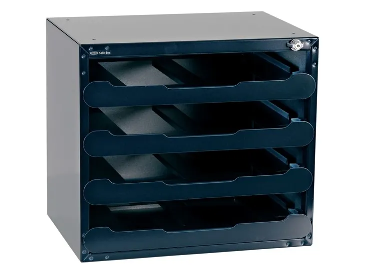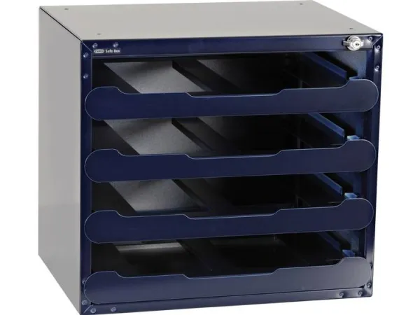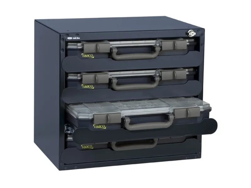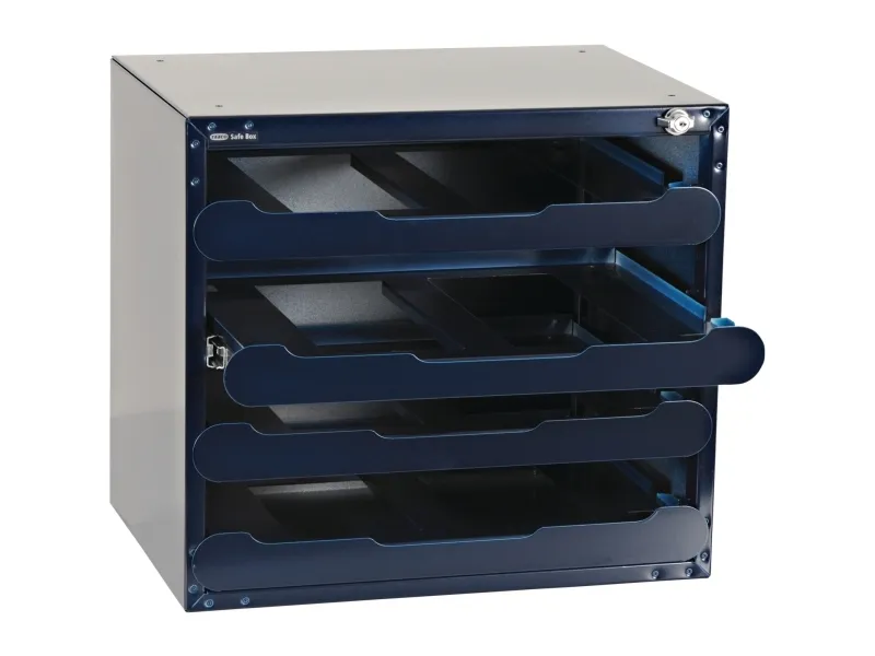 SafeBox 55 (leer) für SortimentskofferSafeBox leer, zur Bestückung mit 4 Sortimentskoffern CarryLite 55 Ihrer Wahl. Die SafeBox ist mit erstklassigen Teleskopschienen und Schlüsselschloss ausgestattet.
