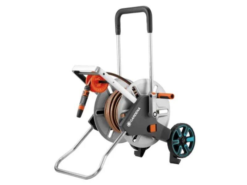 The GARDENA AquaRoll M Easy Metal is particularly sturdy and robust and is able to withstand even the highest strain in the garden. It enables space-saving storage of the garden hose and is convenient to use. The hose can be reliably rolled up using the ergonomic metal crank with soft plastic components and the sturdy hose guide. Due to the foldable foot, it can no longer tip. Its special shape and the visibly high positioning of the wheels can also support the standing security of the Hose Trolley. For space-saving storage, the foot is simply folded, the handle lowered and the crank folded in.