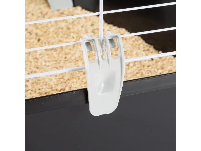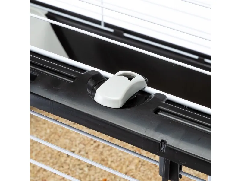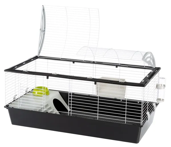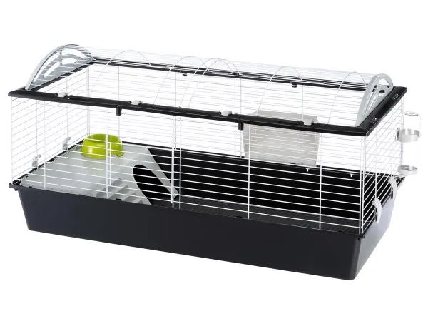Robuster Kleintierkäfig für Meerschweinchen und Zwergkaninchen (max. 2 kg). Das zweiteilige Dach kann komplett oder nur auf einer Seite geöffnet und geschlossen werden. Der Boden hat extra hohe Kanten. Es hat eine kleine Schiebetür an der Vorderseite. Farbbehälter, Gehäuse, Heuraufe und Wasserflasche.