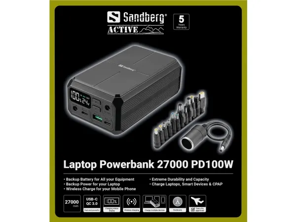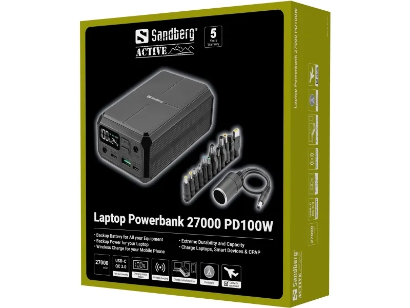 The Sandberg power bank offers a solution for charging laptops and other devices, featuring a capacity of 27,000 mAh and a voltage output range of 4.5 V to 24 V. Equipped with Power Delivery technology, it ensures efficient charging for various types of devices, making it a versatile choice for on-the-go users. The inclusion of multiple output connectors including USB Type-A and three USB-C ports facilitates the simultaneous charging of several devices, while the pass-through charging feature allows for charging the power bank while it supplies power to connected devices. This power bank comes with a user-friendly LED display that indicates the status of charging. The wireless charging capability of 10 W adds convenience, enabling users to charge compatible devices without the need for cables. Designed to comply with standards such as FCC and WEEE, this power bank provides performance while adhering to safety and environmental regulations, making it a reliable choice for everyday use.