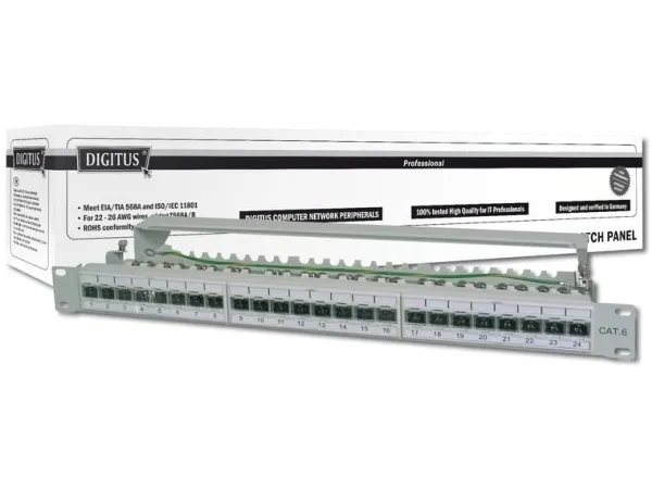 Das DIGITUS® "DN-91624S-EA" CAT 6A Patch Panel ist erhältlich in der 24-Port Version und stellt mit dem 1,5 mm galvanisiertem kaltgewalzten Stahl ein robustes Patch Panel für die 19" Schrankmontage dar. Es entspricht dem 802.3at PoE+ und dem 802.3af PoE Standard und ist mit Staubschutzklappen ausgestattet.
