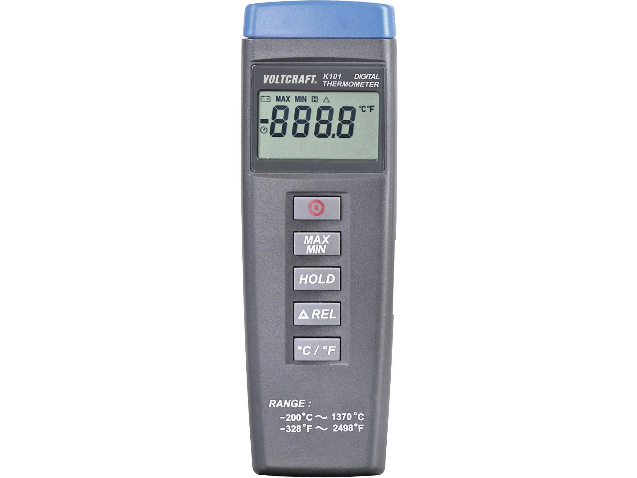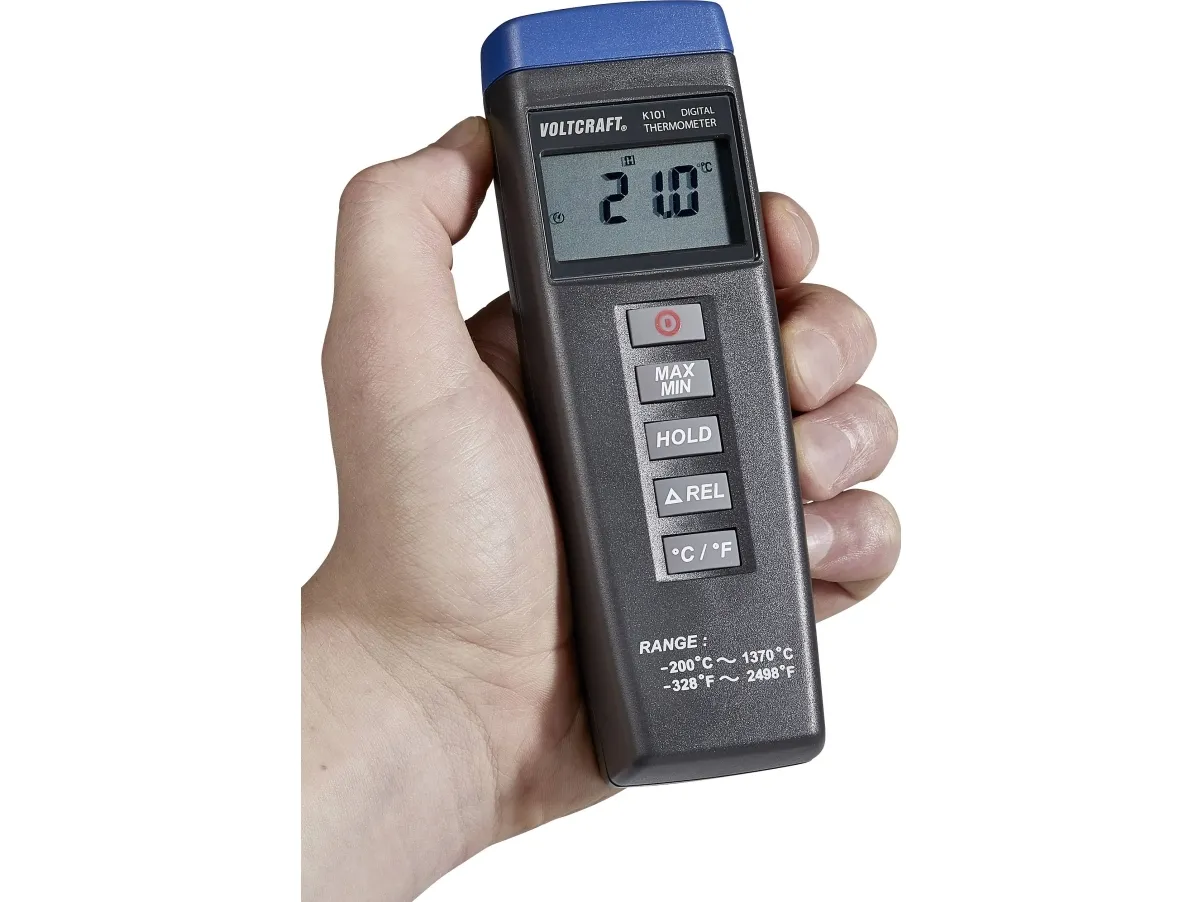 Digitalthermometer K101Min/Max, Data Hold und Relativmessfunktion - einstellbar - ºC/ºF-Umschaltung - automatische Abschaltung - für alle K-Typ-Temperatursensoren mit Miniatur-Thermoelementanschluss Der preiswerte Einstieg in die professionelle Temperaturmessung. K101 ist ein erstklassiges und robustes Temperaturmessgerät zu einem sehr guten Preis. An den Miniatur-Thermoelementanschluss können alle K-Typ-Temperatursensoren angeschlossen werden 1-Kanal