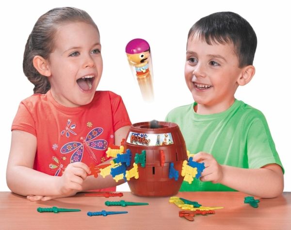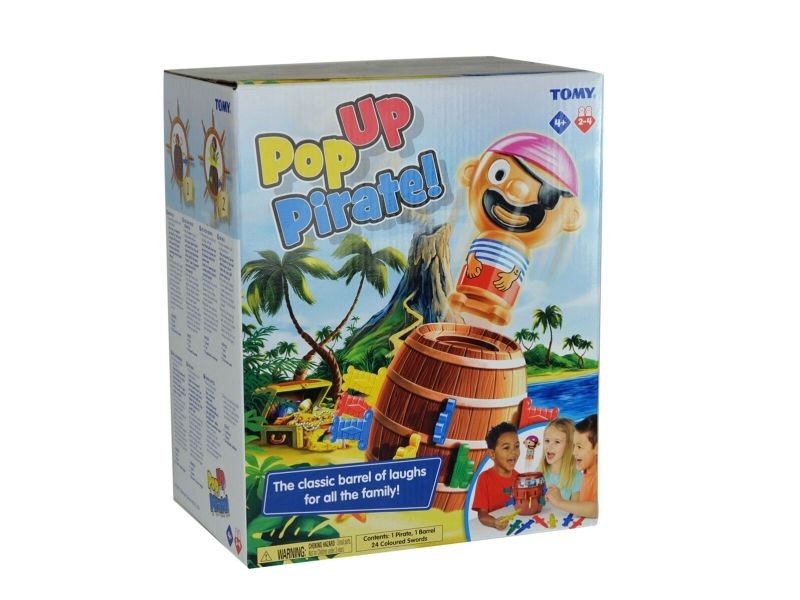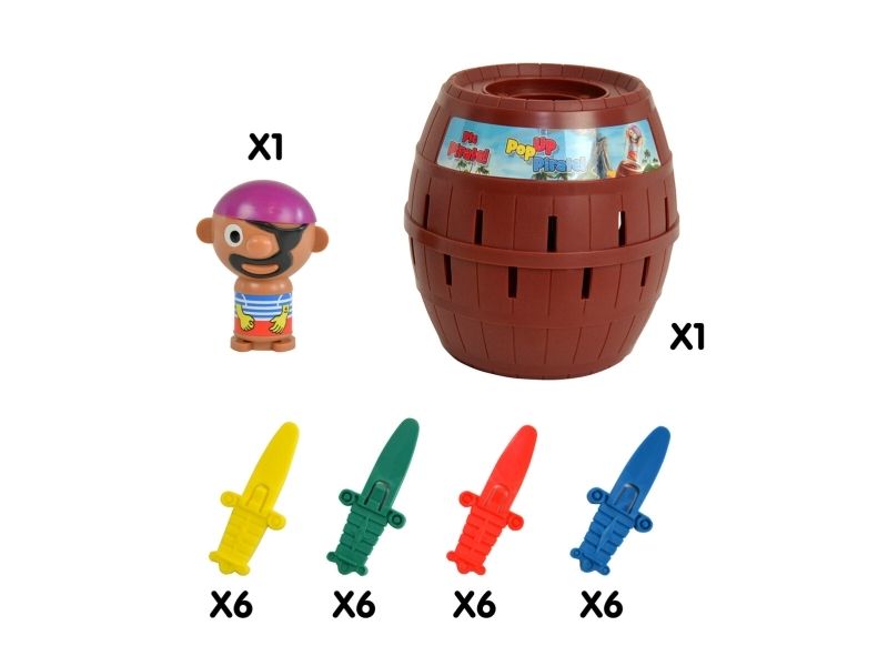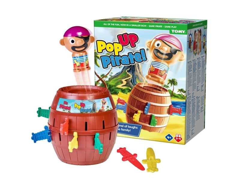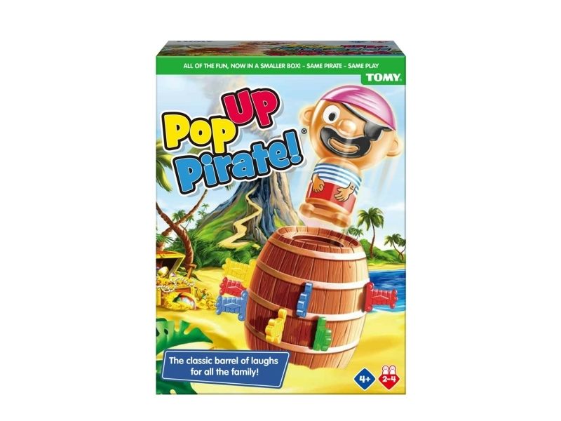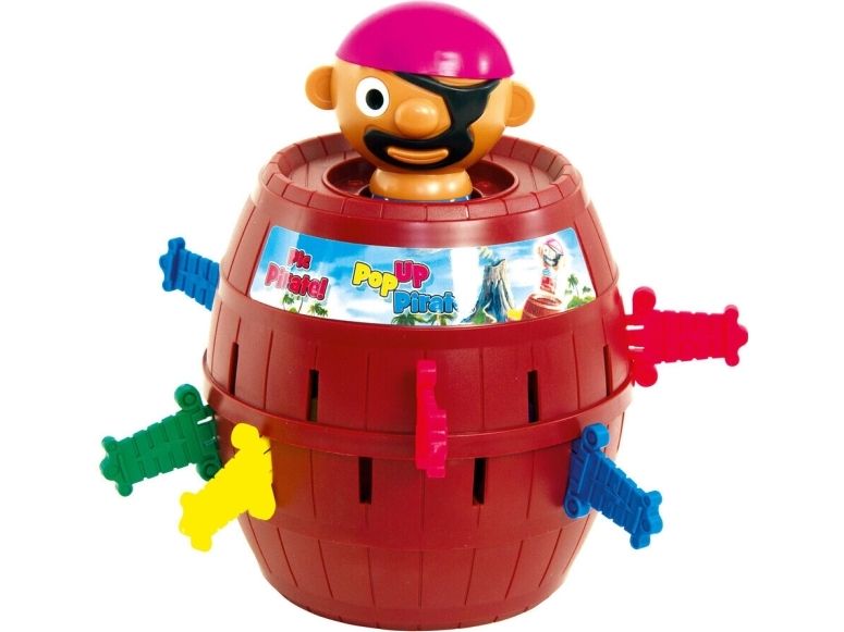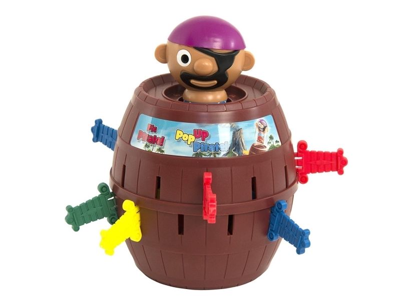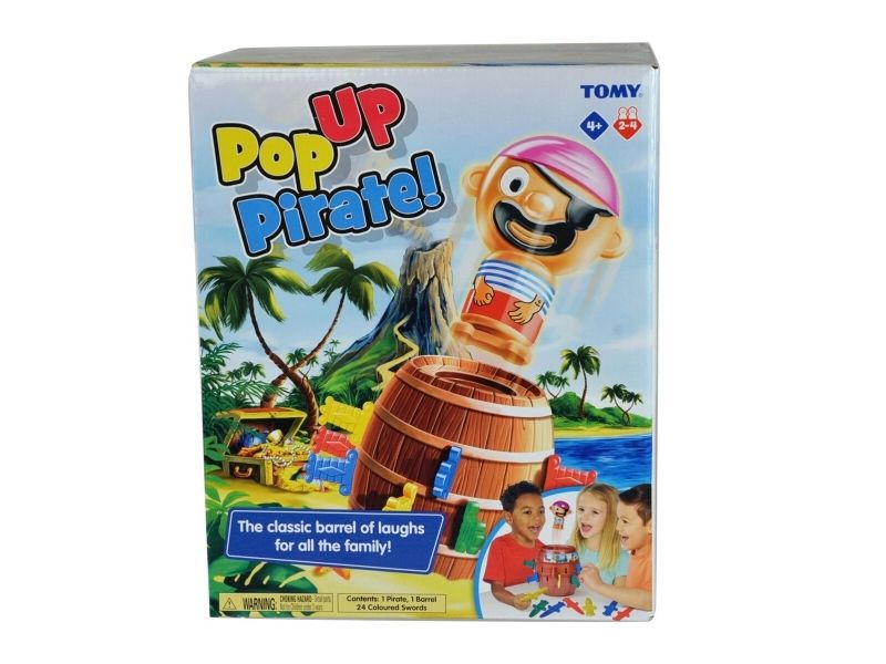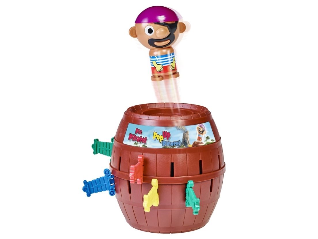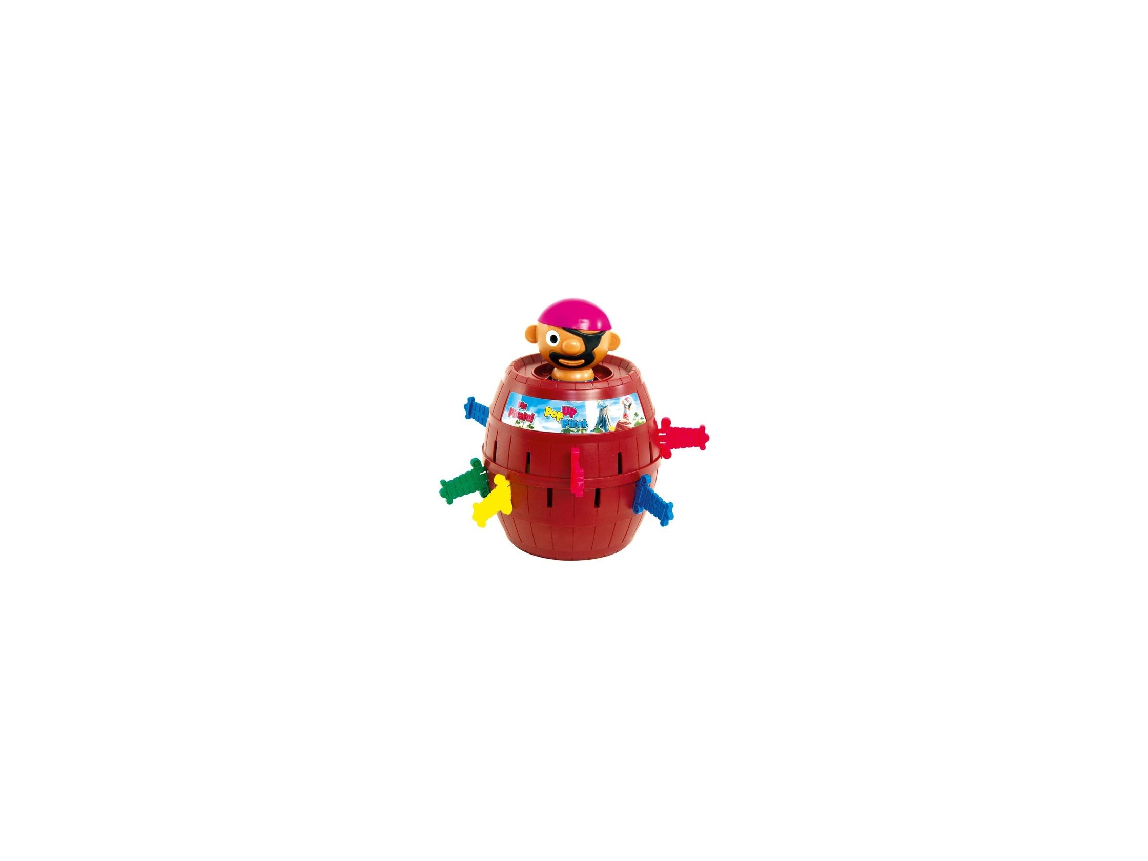 Pop up Pirate von TOMY. Das tolle Actionspiel - nur für echte Piraten! Wähle dein Schwert und stecke es in die dafür vorgesehenen Schlitze des Fasses! Aber pass auf, dass der Pirat nicht aus dem Fass springt - denn sonst hast du verloren. Der Auslösemechanismus wird natürlich bei jedem neuen Spiel von einem anderen Schlitz ausgelöst. Ab 4 Jahren, für 2 bis 4 Spieler.