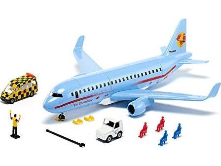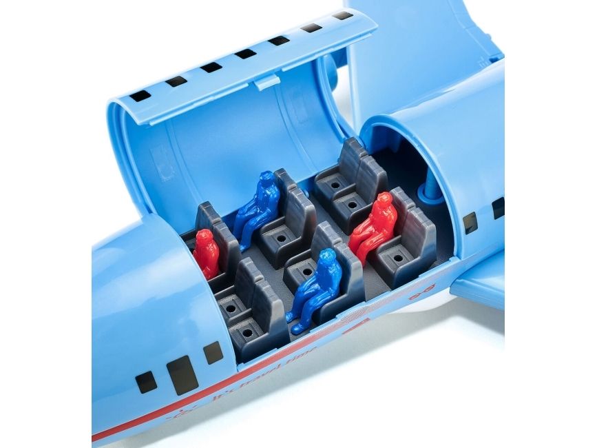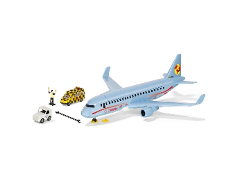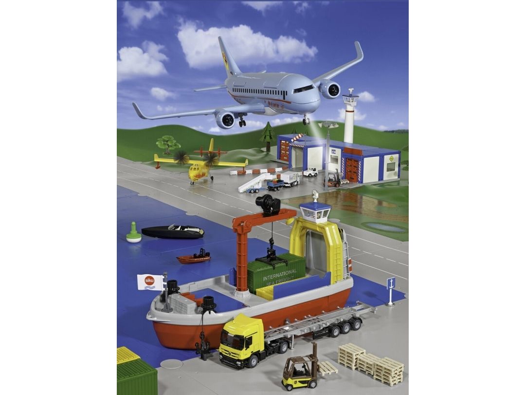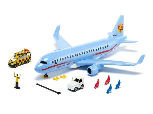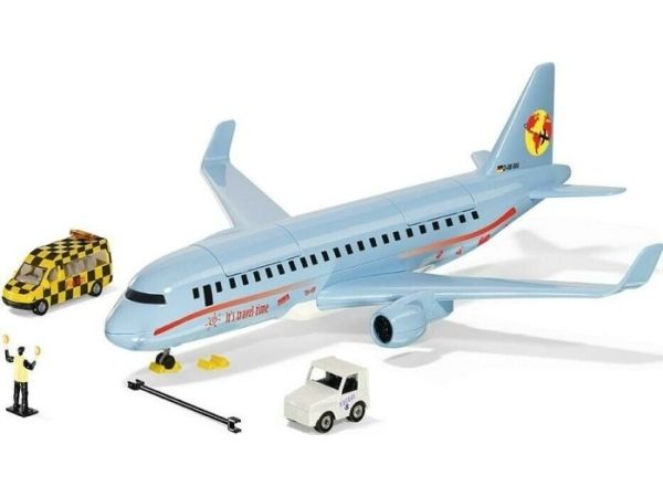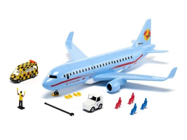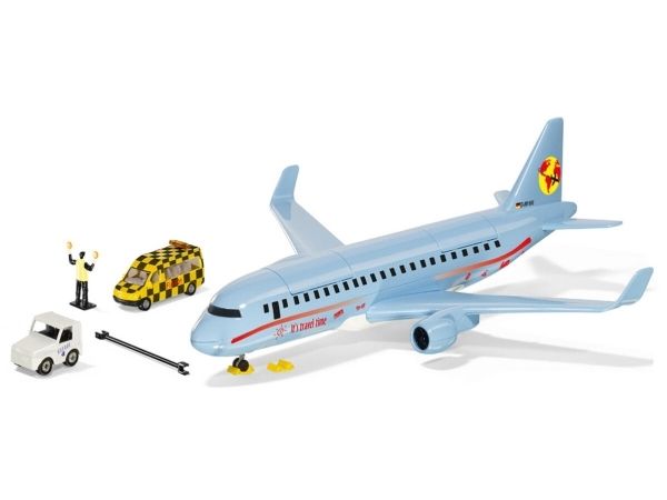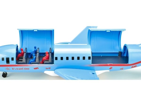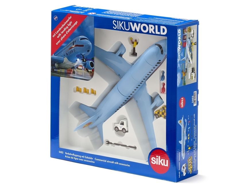On land, sea, and air: The new commercial aircraft extends the SIKUWORLD with another favourite play subject. Boarding time for flight SW 5402. The large aircraft (38.5 cm) with two powerful engines is ready for boarding. But who is sitting where? The cabin staff just has to raise the front flap in the roof and move the four already seated passengers. The rear flap opens a stowage space for a favourite car, which can be brought along for the holiday. Ready for take-off. The aircraft is at the start position. Full thrust – the plane becomes faster and faster, lifts off, and the undercarriage can be retracted. Get ready for the landing approach: Lower the undercarriage and switch on the landing light. After ten minutes of use, the light goes off automatically. The aircraft has landed, and now an elaborately decorated follow-me vehicle with flashing lights guides it along the runway. With a jolt, the large aircraft is attached to the towbar of the aircraft tractor. The marshaller directs the driver to the final parking position. The perfect complement to the commercial aircraft is the new airport set (item number 6312).