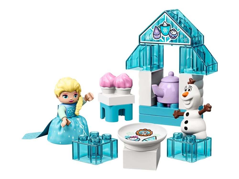 Die Disney-Heldin Elsa und ihr Freund Olaf, der niedliche Schneemann, spielen im Schnee und bauen ein Eishaus! Eine Teekanne, heiße Schokolade und Kuchen auf dem Tisch bilden die Kulisse des Eis-Cafés!