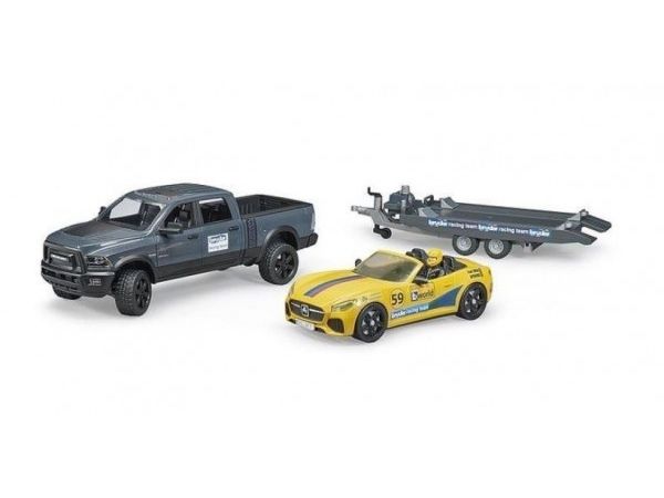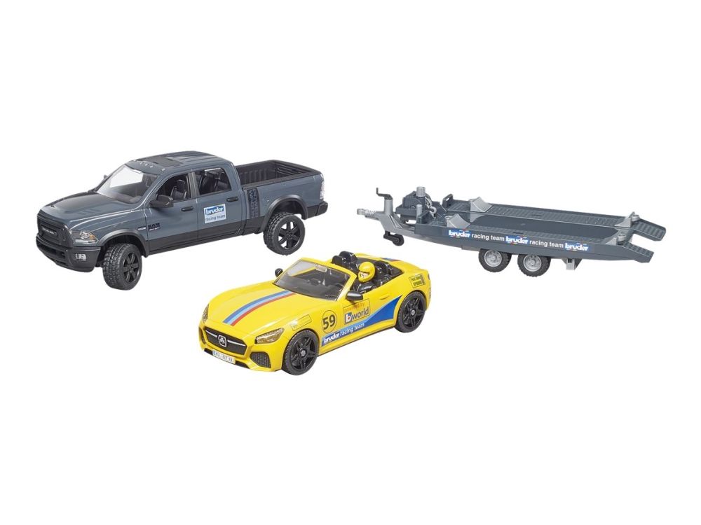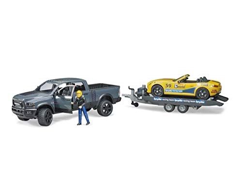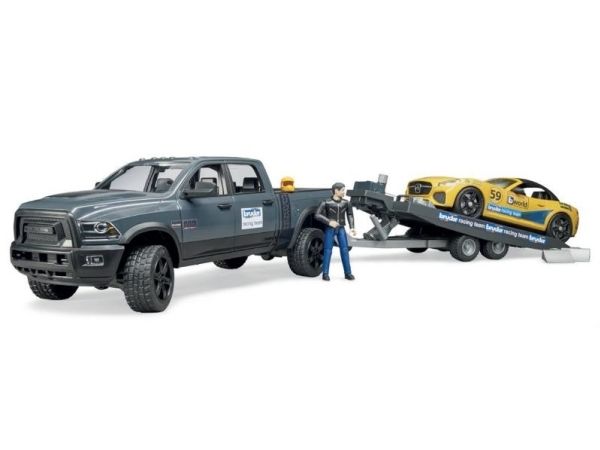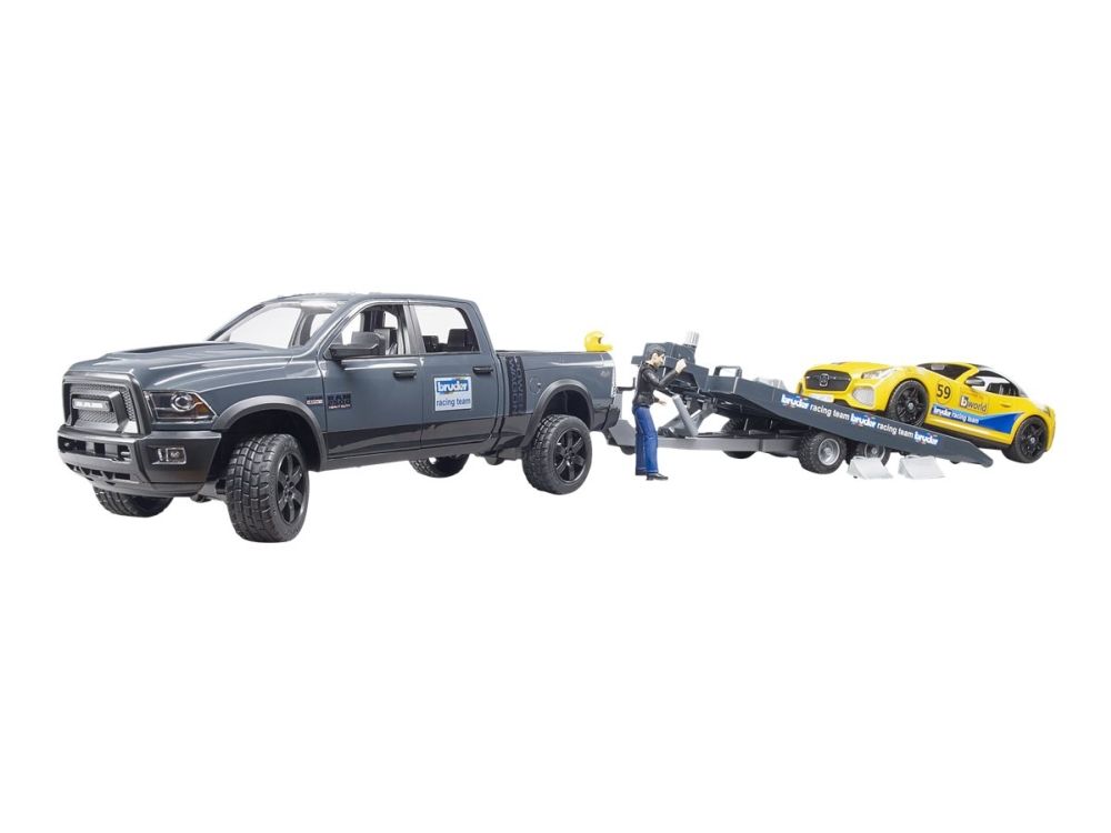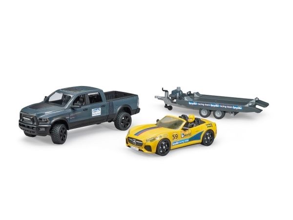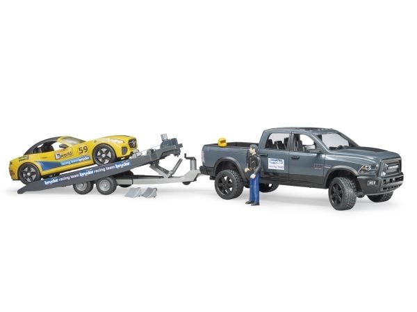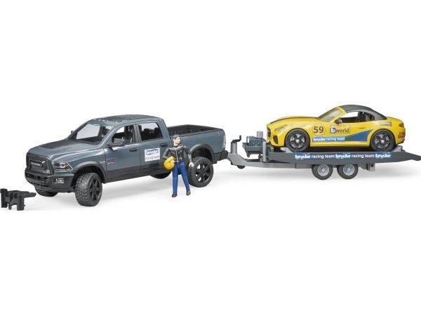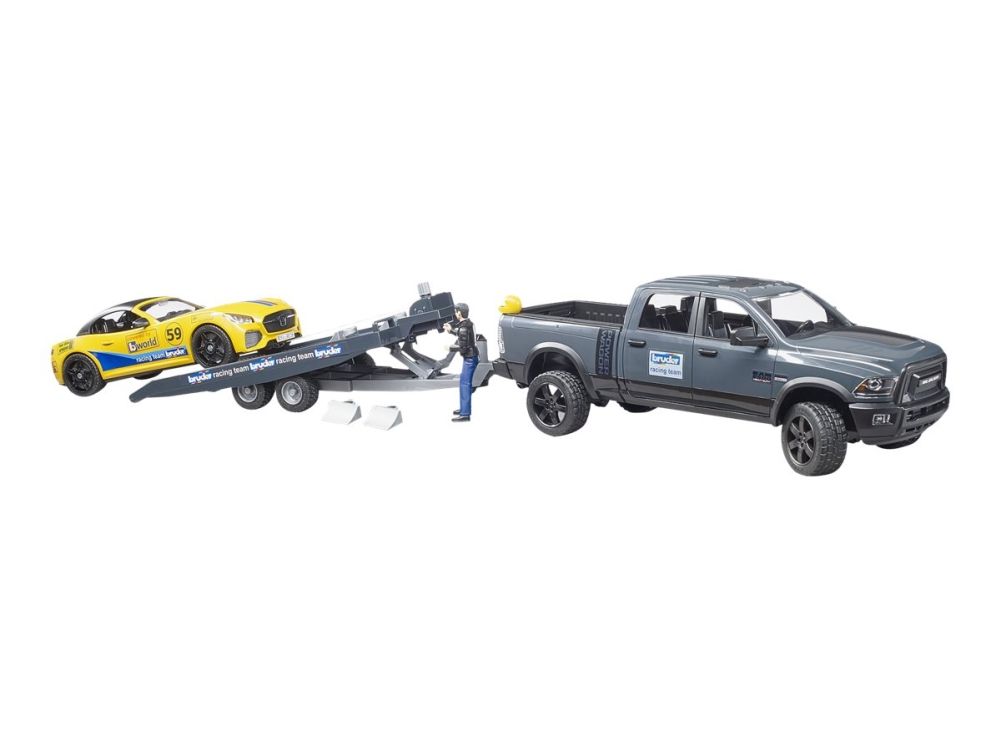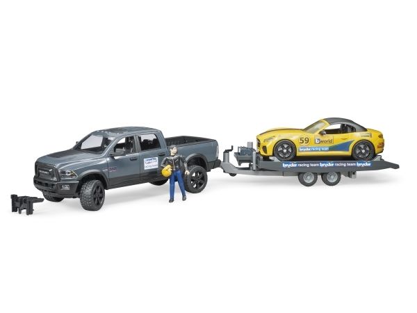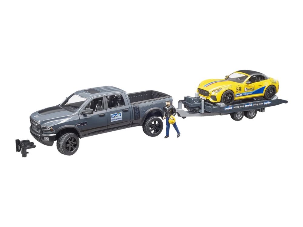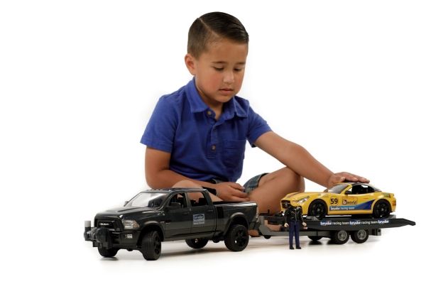 Motorsport übt eine große Begeisterung auf Groß und Klein aus. Dies ist aufgrund der Spannung, des Nervenkitzels und den schnellen Sportwagen auch kein Wunder. Auch BRUDER kann sich dieser Faszination nicht entziehen. Mit dem RAM Powerwagon samt getunten Sportwagen vom Bruder Racing Team, gibt es ein neues, spannendes Gespann in der bworld-Freizeitwelt. Der RAM Powerwagon ist ein Kraftpaket mit bis zu 410 PS und Allradantrieb, das souverän den Rennsportwagen an die Rennstrecke bringt. Bei diesem Pick Up sind alle 4 Türen zum Öffnen und über die bekannte Lenkradverlängerung lässt sich das Fahrzeug einfach manövrieren. Für den sicheren Transport und die Verladung ist der Transportanhänger mit einer kippbaren Plattform, Unterlegkeilen und Seilwinde ausgestattet. Der Roadster besitzt ein abnehmbares Dach, wodurch der enthaltene Rennfahrer in das Fahrzeug gesetzt werden kann. Des Weiteren ist der Sportwagen mit dem neuen Radwechselsystem von BRUDER ausgestattet. Damit jeder kleine Rennfahrer seinen Flitzer individuell gestalten kann, ist ein großer Etikettenbogen mit vielen Stickern beigelegt. Motorsport übt eine große Begeisterung auf Groß und Klein aus. Dies ist aufgrund der Spannung, des Nervenkitzels und den schnellen Sportwagen auch kein Wunder. Auch BRUDER kann sich dieser Faszination nicht entziehen. Mit dem RAM Powerwagon samt getunten Sportwagen vom Bruder Racing Team, gibt es ein neues, spannendes Gespann in der bworld-Freizeitwelt. Der RAM Powerwagon ist ein Kraftpaket mit bis zu 410 PS und Allradantrieb, das souverän den Rennsportwagen an die Rennstrecke bringt. Bei diesem Pick Up sind alle 4 Türen zum Öffnen und über die bekannte Lenkradverlängerung lässt sich das Fahrzeug einfach manövrieren. Für den sicheren Transport und die Verladung ist der Transportanhänger mit einer kippbaren Plattform, Unterlegkeilen und Seilwinde ausgestattet. Der Roadster besitzt ein abnehmbares Dach, wodurch der enthaltene Rennfahrer in das Fahrzeug gesetzt werden kann. Des Weiteren ist der Sportwagen mit dem neuen Radwechselsystem von BRUDER ausgestattet. Damit jeder kleine Rennfahrer seinen Flitzer individuell gestalten kann, ist ein großer Etikettenbogen mit vielen Stickern beigelegt.