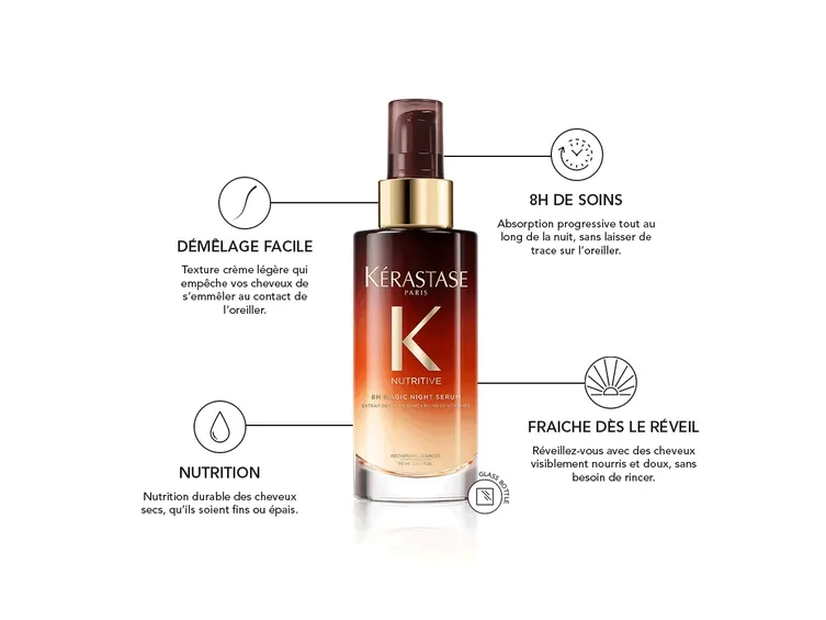 An intensely nourishing overnight serum which nourishes your hair while you sleep. The non-greasy formula, containing iris root extract and blend of 5 essential vitamins, leaves hair feeling lightweight and luxuriously nourished in the morning with no need to rinse out. With its beautiful fragrance designed to develop whilst you sleep, this is the perfect addition to your night time beauty regime.