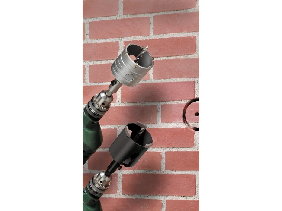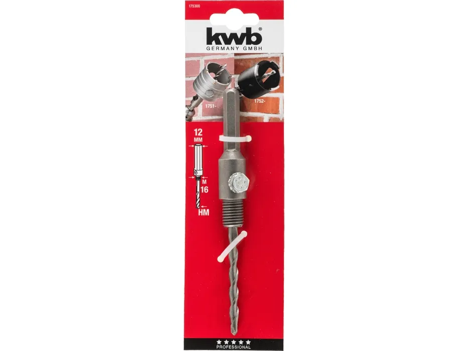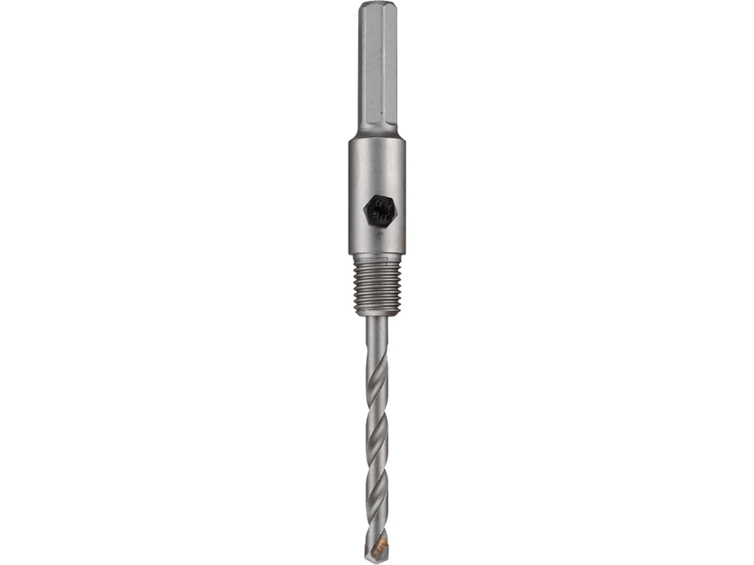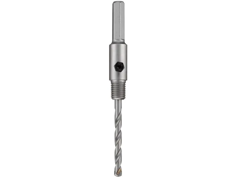Aufnahmeschaft mit Zentrierbohrer, Aufnahmeschaft Sechskant SW12 und SDS plus, Gewinde M16, passend für alle Hohlbohrkronen, hartmetallbestückt, Diamant bestückt, für den Einsatz in allen Dreh- und Schlagbohrmaschinen.