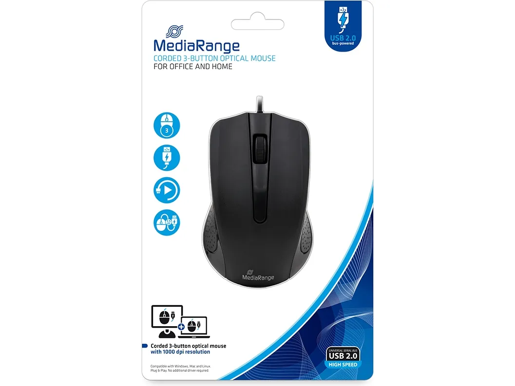 MediaRange input devices are perfect for all applications in the office or at home. MediaRange's optical 3-button mouse can be quickly and easily connected via the USB plug with any computer and is ready to use with most common operating systems.