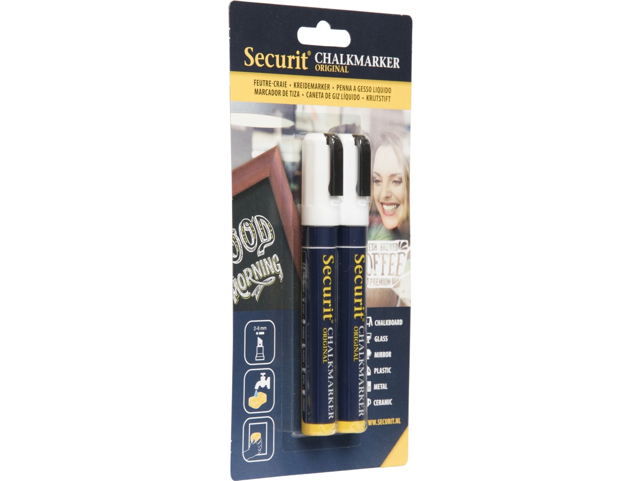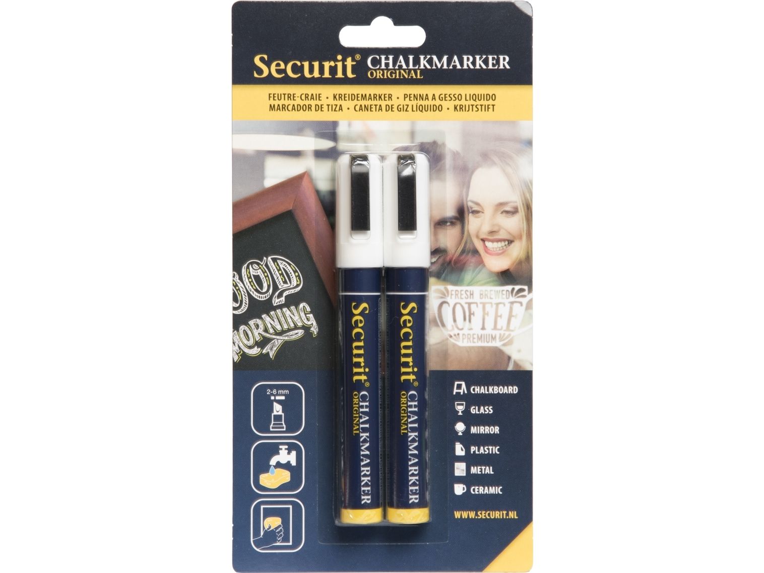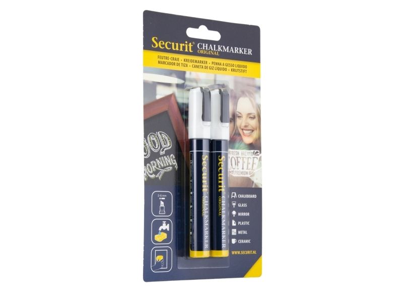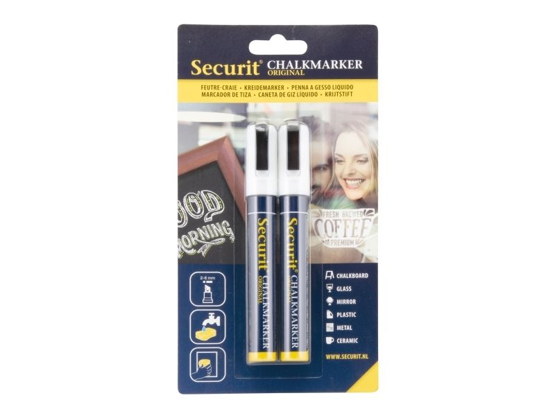 varianterSecurit® Original kridtmarker er gennem årene blevet videreudviklet, og er stadig verdens bedste kridtmarker. Dette sæt indeholder to kridtmarkere i hvid. Giftfrie, meget uigennemsigtige flydende kridtmarkere med en 2–6 mm skrå spids. Tværer ikke ud når det er tørret . Velegnet til alle ikke-porøse overflader. Let at bruge: ryste pennen, tag hætten af,