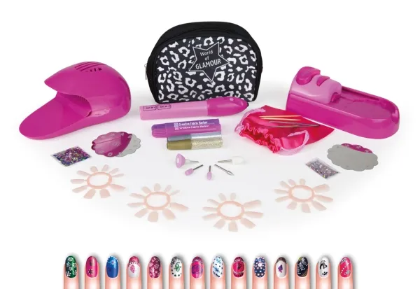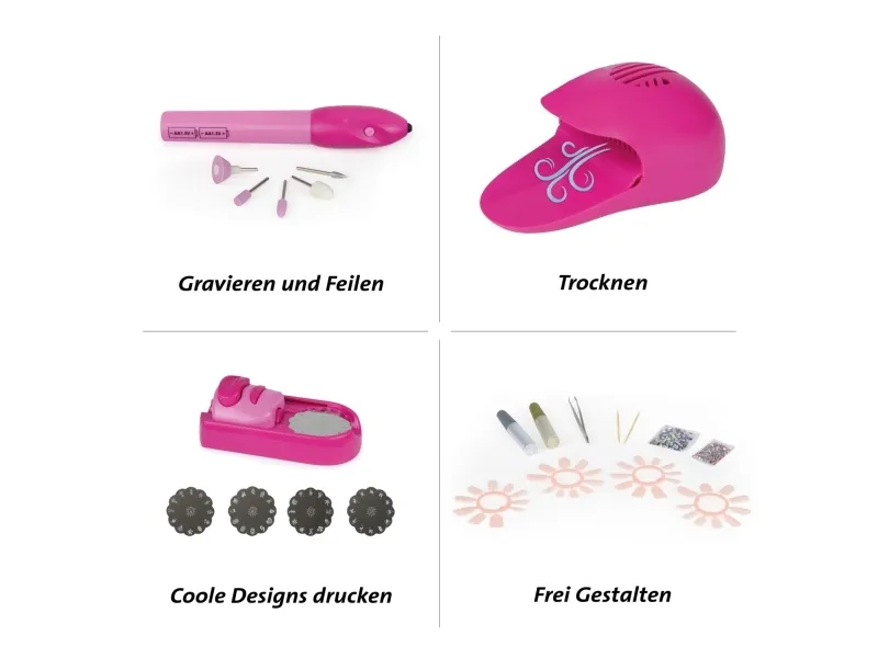 LENA® Mani-Pedi Nail Salon 4 in 1 Set bestehend aus Nagelformer mit 5 Aufsätzen, Nageldesign-Drucker mit 48 Motiven, Glitter-Nagelkopfstein, Nageltrockner und Aufbewahrungsbeutel zum Färben. 10 Designs zum freien oder nach Anleitung gestalten der Nägel Benötigt 4 x -1,5 V LR6 "AA" Batterien (nicht enthalten) Geeignet für Kinder ab 8 Jahren Detaillierte bebilderte Anleitung enthalten Verpackt in einem Lieferkarton mit Produktinformationen. Über Lena Creative Toys Lena Creative Toys wird in Europa von der deutschen Firma Simm Spielwaren entwickelt. Alle Produkte werden in hoher Qualität hergestellt und mit einer 3-Jahres-Garantie verkauft, die mindestens alle EU-Vorschriften im Bereich der Produkte für Kinder erfüllt.