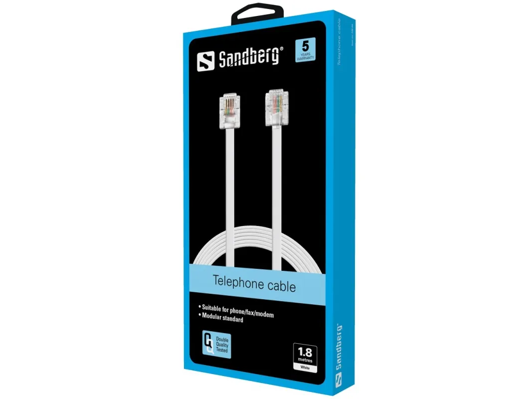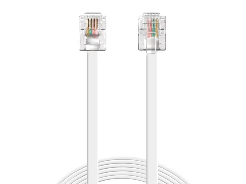 Telefonkabel mit einem RJ11-Anschluss an jedem Ende. Das Kabel kann zum Beispiel auch verwendet werden, um ein Telefon mit einem RJ11-Stecker an eine Dose anzuschließen.
