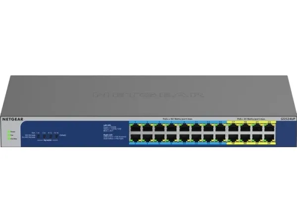 Sofortige Konnektivität und zuverlässige Leistung Die NETGEAR Gigabit Unmanaged Switch-Serie unterstützt Ihr Unternehmen dabei, Ihr Netzwerk kostengünstig auf Gigabit-Geschwindigkeiten und höhere Portzahlen auszuweiten. Der GS524UP ergänzt die Serie und bietet 16 Ultra60 PoE++ Ports und 8 PoE+ Ports zur Stromversorgung von PoE-Geräten mit hoher Leistung. Mit einem PoE-Gesamtbudget von 480 W stellen Sie PoE+ und PoE++ Geräte auf einem einzigen Switch statt auf mehreren Switches bereit. Der GS524UP ist energieeffizient, auf lange Lebensdauer ausgelegt und wird intensiv getestet, um die Zuverlässigkeit zu bieten, die Ihr Unternehmen benötigt. Priorisierung des 802.1p-Datenverkehrs und Jumbo Frame Support gestatten die nahtlose Integration in komplexere Netzwerke.