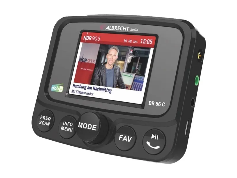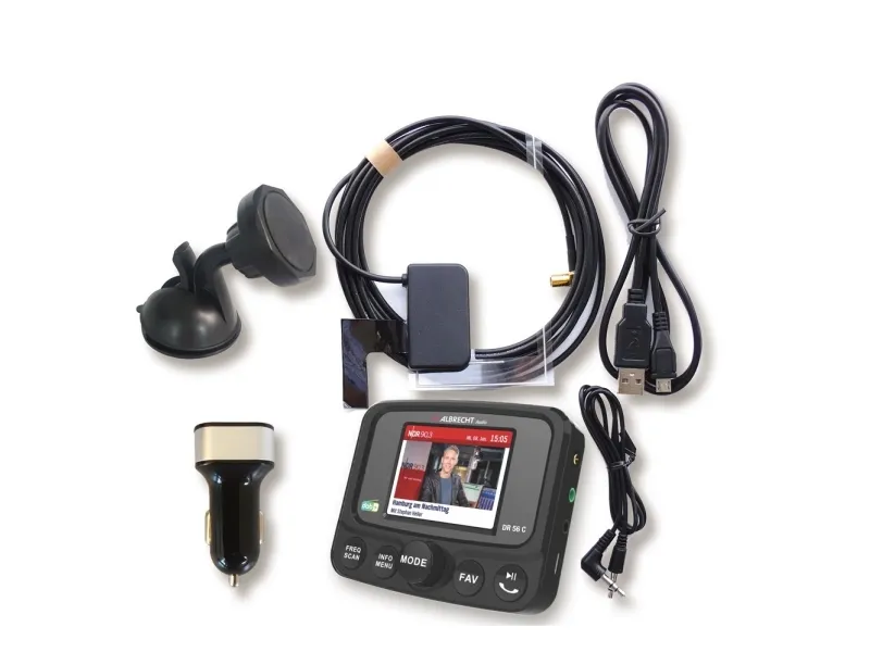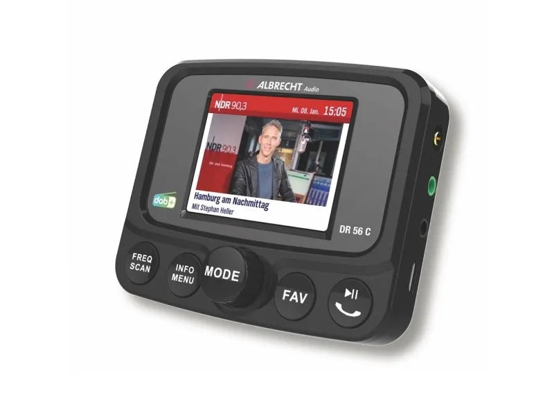 Albrecht DR 56 C DAB+ bilradio-tuner med farvedisplay6.1 cm (2.4 tommer) TFT-farvedisplay med 6 linjer og baggrundsbelysning · DAB Slideshow i fuld skærm · Tastbelysning kan slås fra FM-transmitter til trådløs overførsel til din bilradio · MP3 afspiller via micro SD-kort · Automatisk alternativ frekvenssøgning · Håndfri funktion til din mobiltelefon · Aktiv antenne (SMB-tilslutning) for den bedste modtagelse og nem installation · Sugekopholder med drejeligt kugleled · Modtagerstabilisator for høje hastigheder · 11 menusprog: Engelsk, tysk, italiensk, fransk, hollandsk, Spansk, norsk, svensk, dansk, finsk og polsk · 2 lysstyrketrin · Tastbelysning kan slås fra · 20 favorithukommelser · Kanalliste: Op til 230 stationer · Aux-in og aux-out til tilslutning af eksterne lydenheder eller kabelforbindelse til bilradio - USB-lademulighed til eksterne enheder (for eksempel mobiltelefon) · Manuel og automatisk kanalsøgningAlbrecht DR 56 C fra Albrecht Audio er den første digitalradio-adapter ti