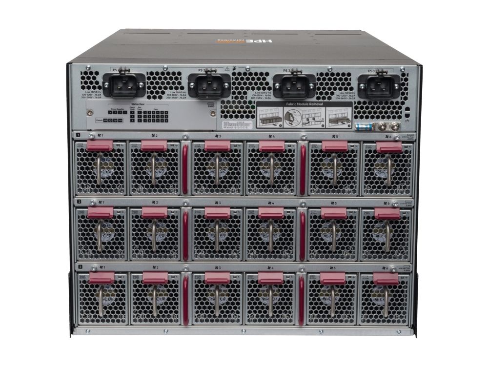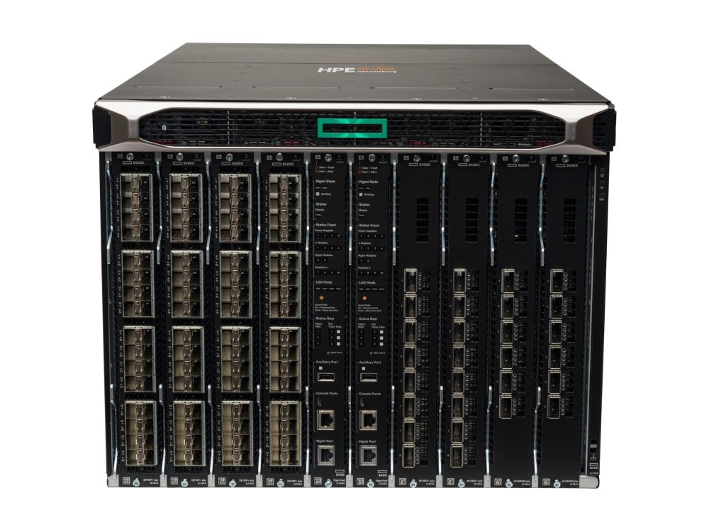Aruba 8400 Paket mit einem Management-Modul, drei Netzteilen, zwei 8400X Fabric-Modulen, einem 10G-Modul mit 32 Ports und einem 40G-Modul mit 8 Ports