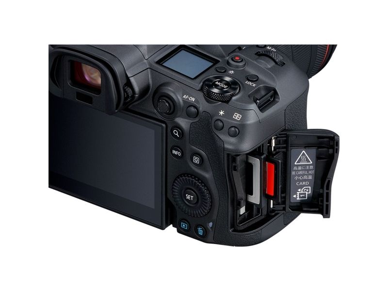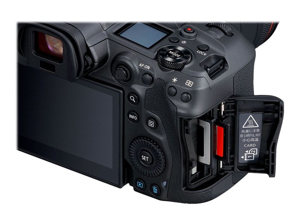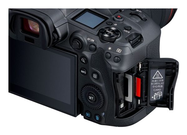Die Canon EOS R5 kann JPEG-, HEIF- oder RAW-Dateien aufnehmen, und mit den zwei Kartensteckplätzen kannst du verschiedene Dateien auf verschiedene Karten speichern. Ein Steckplatz nimmt blitzschnelle CFexpress-Karten auf – wir empfehlen CFexpress 1.0 (400 MB/s oder höher) für eine optimale Videoleistung – während der andere Steckplatz SD-Karten bis zu V90 UHS-II Geschwindigkeiten unterstützt
