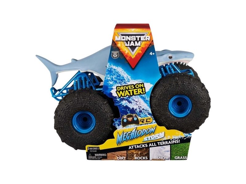 Haie sind der Hammer! Freu dich auf stundenlange Action mit dem Megalodon Storm RC von Monster Jam! Diese wilde Maschine meistert jedes raue, nasse und schroffe Terrain! Dreck, Felsen, Schnee, Gras - sogar Wasser! Der Megalodon ist unaufhaltsam und überwindet jedes Hindernis. Er ist eine Miniaturkopie des echten Megalodon, mega cool!