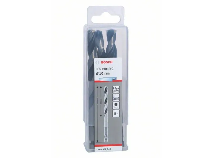 The HSS Twist Drill Bit PointTeQ enables fast drilling in metal due to its PointTeQ tip design. Quick and easy drilling starts are possible as the self-centering tip prevents wandering. Because of its increased drilling rate, less heat and wear are generated. The PointTeQ tip design remains sharp and ensures continuous durability. This bit is suitable for drilling clearance and pilot holes in alloyed and non-alloyed steel, non-ferrous metals, cast steel, cast iron and plastics. It has a cylindrical shank system (shank equal to drill bit diameter) and is intended for use in drill stands and drill drivers.