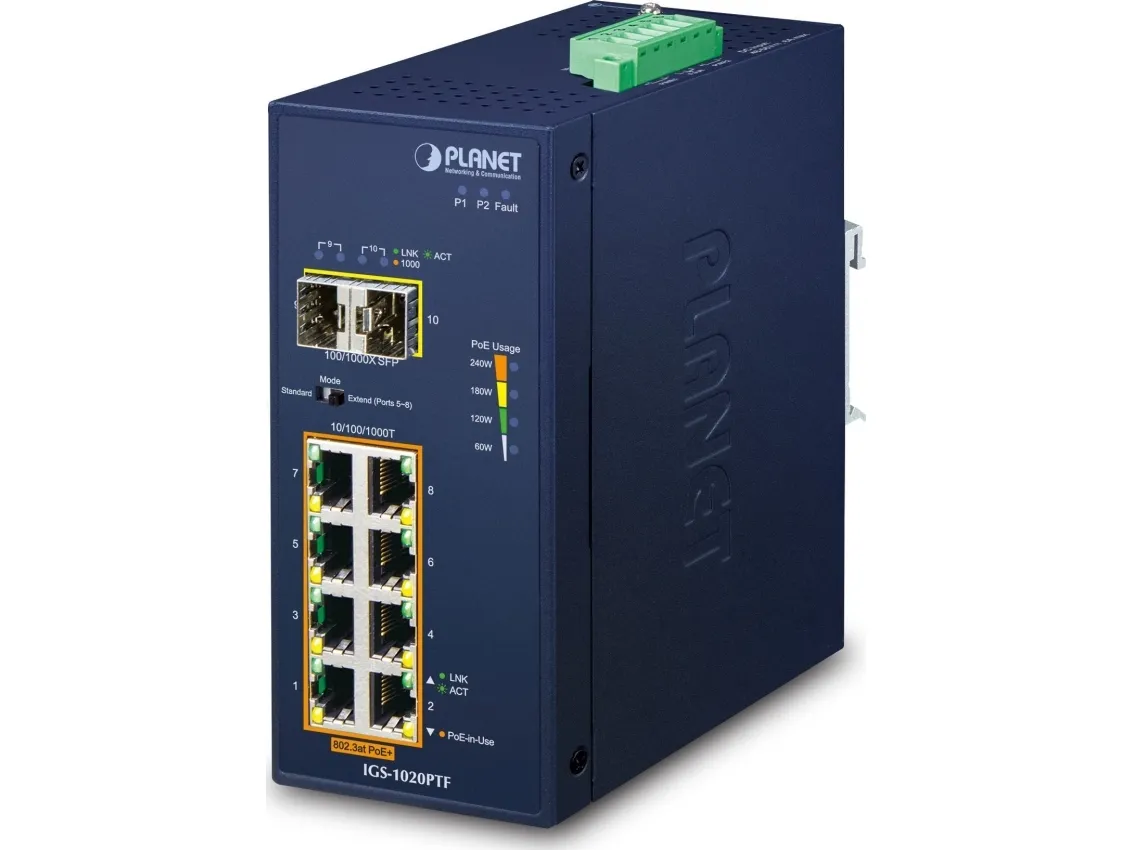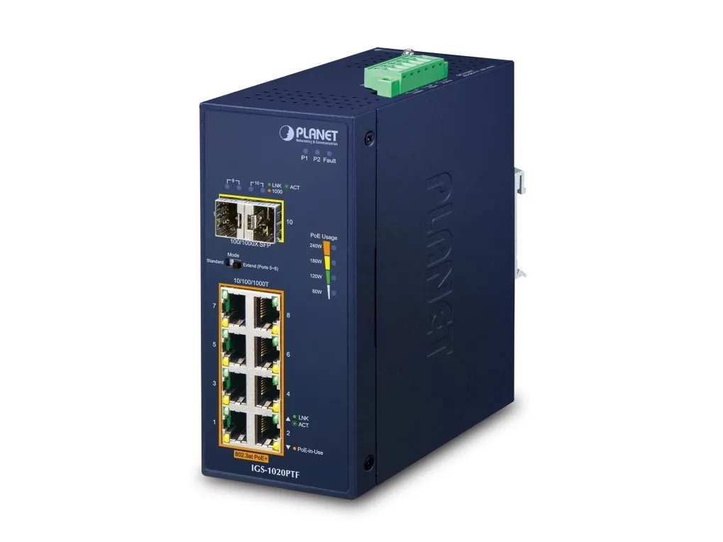 Featuring Plug and Play and designed to be installed in heavy industrial demanding environments, PLANET IGS-1020PTF is an industrial-grade, DIN-rail type Unmanaged Gigabit Ethernet PoE+ Switch with eight 10/100/1000BASE-T ports featuring IEEE 802.3at PoE+ and two 100/1000BASE-X fiber optic interfaces for uplink connection.