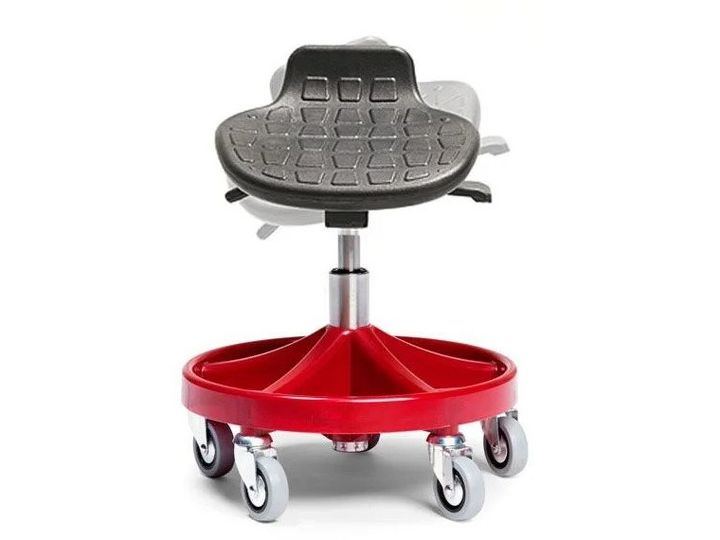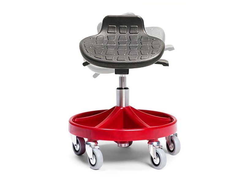 Arbejdsstol All-Round Comfort, her med rødt understel og 75 mm hjul, er en smart og robust arbejdsstol / montørstol, tilpasset til dig som har meget arbejde siddende på hug. I stolens understel finder du 5 praktiske rum for opbevaring af det du benytter mest i løbet af en arbejdsdag. Comfort-udgaven af arbejdsstol All-Round, har et vinklingsbart og klassisk udseende industristolssæde i PU-skum, med trinløs justering af siddehøjde 390 - 510 mm. Denne praktiske arbejdsstol er egnet for brug på værkstedet, ved monteringsarbejde eller også i forbindelse med arbejde i skole og børnehaver.