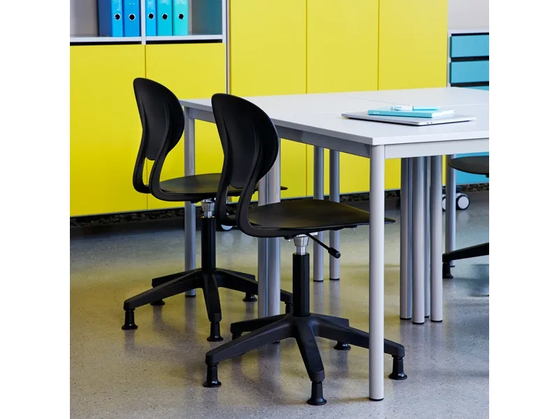 Tisch Combi 200 mit Stahlrahmen, Beine Ø40 mm mit Innenverstärkung für maximale Stabilität, Rahmen 40×20 mm, Tischplatte mit Hochdrucklaminat und ABS-Kantenumleimer. In dieser Serie sind auch halbrunde und runde Tische erhältlich.