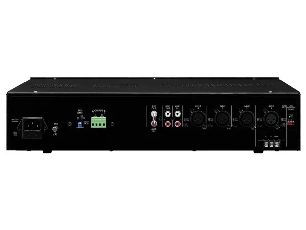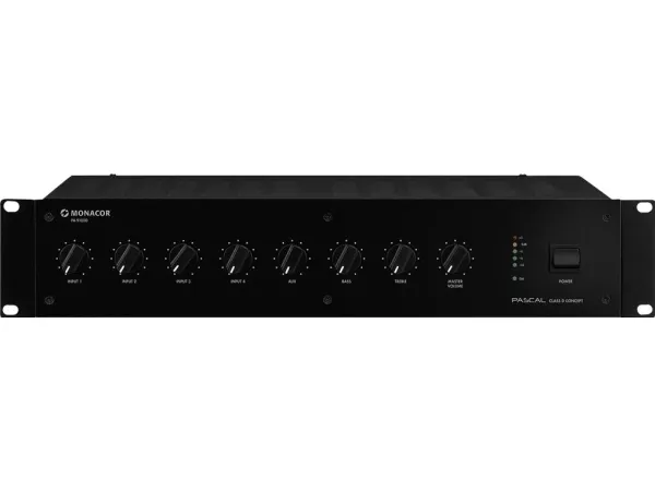 Mono class D PA mixing amplifier;#1 x 1,000 W;#Class D concept with PASCAL amplifier module;#Energy-efficient concept due to high efficiency;#Lightweight design due to compact switch-mode power supply;#Silent operation due to fanless cooling concept;#4 balanced mic/line inputs;#Mic 1 with priority circuit and automatic talkover;#Additional connection for desktop microphone via screw terminal;#1 aux input;#Speaker outputs via screw contacts;#Line output;#Insert facility, e.g. for effect units, equalizers, feedback controllers;#Input level control and output level control;#2-way tone control for the output;#48 V phantom power supply for each microphone input, to be activated individually;#Limiter switch 4 Ω/8 Ω/100 V;#Removable mounting brackets;;Manufacturer information:;MONACOR INTERNATIONAL GmbH & Co. KG Konsul-Smidt-Str. 68 28217 Bremen Germany [email protected];Safety Notes and Warning Messages;The unit uses dangerous mains voltage. Leave servicing to skilled personnel only and do not insert anything into the air vents. Inexpert handling may result in electric shock. During operation, there may be a hazard of contact with a dangerous voltage of up to 100 V at the speaker terminals. Always switch off the amplifier before making or changing any connections. Do not operate the unit and disconnect the mains plug from the socket immediately if the unit or the mains cable is visibly damaged; if a defect might have occurred after the unit was dropped or suffered a similar accident, if malfunctions occur. In any case, the unit must be repaired by skilled personnel. The unit is suitable for indoor use only. Protect it against dripping water and splash water, high air humidity and heat (admissible ambient temperature range: 0 - 40 °C). Never pull the mains cable to disconnect the mains plug from the socket, always seize the plug. The heat generated inside the unit must be dissipated by air circulation; never cover the air vents of the housing. If the unit is to be put out of operation permanently, take it to a local recycling plant for a disposal which is not harmful to the environment.