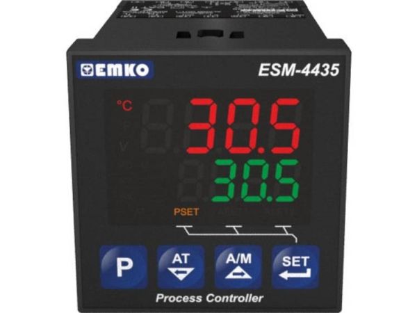 Emko ESM-4435.2.20.0.1/01.01/0.0.0.0 2-punkt, P, PI, PD, PID Temperaturregulator4-cifret procesvisning 4-cifret sætpunkt-visning Universal måleindgang til Pt100, J, K, R, S, T, 0-50 mV, 0-10 V, 0/4-20 mA 2-punkts, P, PI, PD eller PID regulering PID-selvoptimeringsfunktion Hysterese Varme- eller kølefunktion kan vælges 2 alarmudgange. Funktionen kan indstilles til, fra eller cyklisk i tilfælde af et Sensordefekt Adgangskodebeskyttelse til programindstillinger