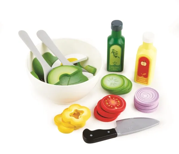 Bereite eine gesunde Mahlzeit zu mit diesem fantastischen Hape Healthy Salad Play Set. Enthält eine Salatschüssel mit Löffel, Gabel, ein realistisch aussehendes Spielmesser, zwei Flaschen Dressing, Eier, Avocado, Gurke, Kartoffel, Zwiebel und anderes Gemüse, das mit dem Messer geschnitten werden kann. Mit glatten, abgerundeten Kanten, die perfekt für kleine Finger zum Greifen sind. Hervorragend geeignet für die Entwicklung von Feinmotorik, Sprache und sozialen Fähigkeiten. Enthält insgesamt 29 Teile.