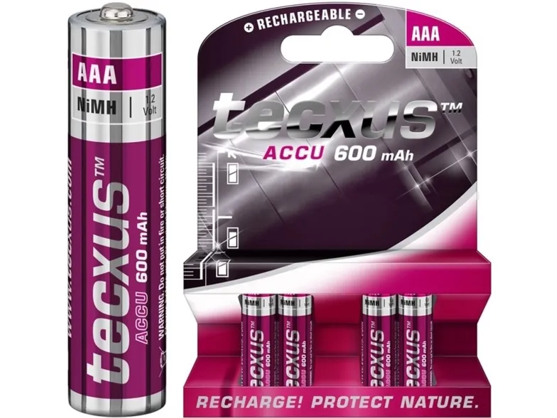 Nickel-Metallhydrid Akku (NiMH), 1,2 V tecxus Akku-Batterien sind besonders umweltfreundlich, da sie bis zu 1000x wiederaufladbar sind. Die Microbatterien sind zuverlässige Energiespender für die konstante Stromversorgung von Geräten des täglichen Bedarfs. Die AAA Batterien zeichnen sich durch hohe Leistungsfähigkeit aus und eignen sich für Geräte mit großem Energiebedarf. Die wiederaufladbaren Batterien haben eine lange Lebensdauer für Anwendungen mit konstant niedrigem Energieverbrauch. Batterien eignen sich für schnurlose Telefone, Kameras und Mikrofone. Die aufladbaren Batterien haben keinen Memory-Effekt, weshalb eine vollständige Entladung nicht notwendig ist.