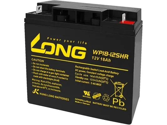 Langer Blei-Säure-Akku WP18-12SHRLgeringe Selbstentladung - lange Lebensdauer - wartungsfrei - Temperaturbereich -20 bis +50 °C. - robustes ABS-Kunststoffgehäuse - erfüllt die Anforderungen von IATA / A67 und IMDG Den 238 - UL 1989 zertifiziertUniversell einsetzbarer und hochwertiger Blei-Säure-Akku, der für eine Vielzahl von Anwendungen verwendet werden kann. Geeignet z.B. für USV, Telekommunikationssysteme, Notbeleuchtung, elektronische Registrierkassen, medizinische Geräte und Systeme, Brandmeldeanlagen, Elektrowerkzeuge, Kinderspielzeug, Elektrofahrzeuge, Elektromopeds u.v.m.