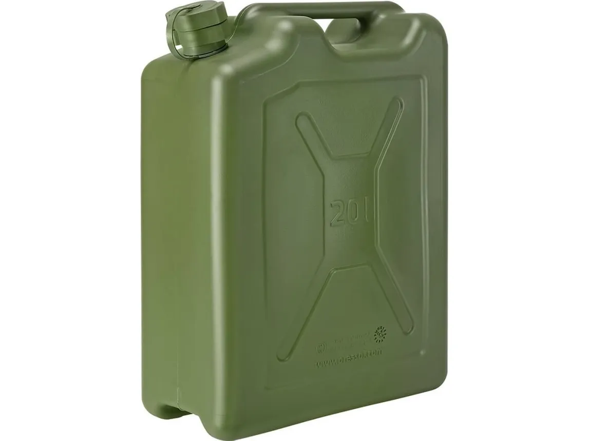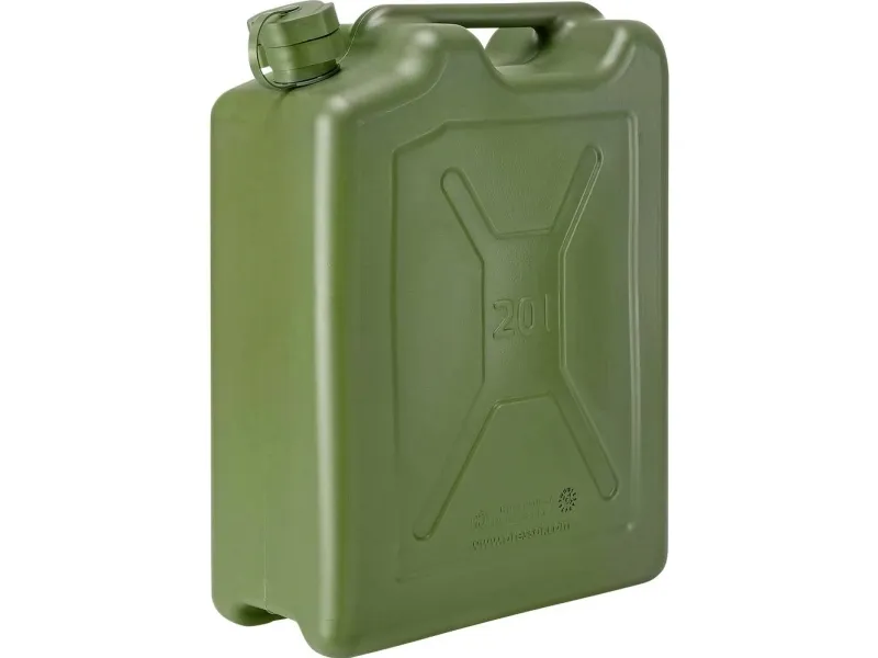 Hær-brændstofbeholder-20 l PE-med fleksibel udløb-olivenMed fleksibelt udløbsrør · udløbsrør opbevares i dunken · udløbsrør med integreret udluftning · med fikseringsbånd sikret mod tab · ingen rustpartikler i brændstoffet · mindre vandkondensat i dunken · udløb integreret i dunken med patenteret kanisteluering inkl. udluftning · ingen tilsmudsning af udløb med · mål militærbeholder-konform · lavere temperaturledningsevne i forhold til ståludførelse · egnet til flydende brændstoffer · robust og ufølsom over for slagpåvirkning · UN-godkendelse.