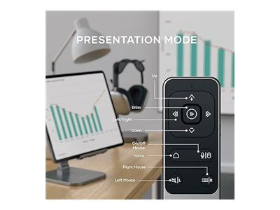 Switch to Presentation mode to effortlessly navigate on-screen applications and guide presentations with four-way arrows, Home, left/right mouse, and mouse on/off buttons (on-screen laser pointer – enabled in PowerPoint and Keynote settings).