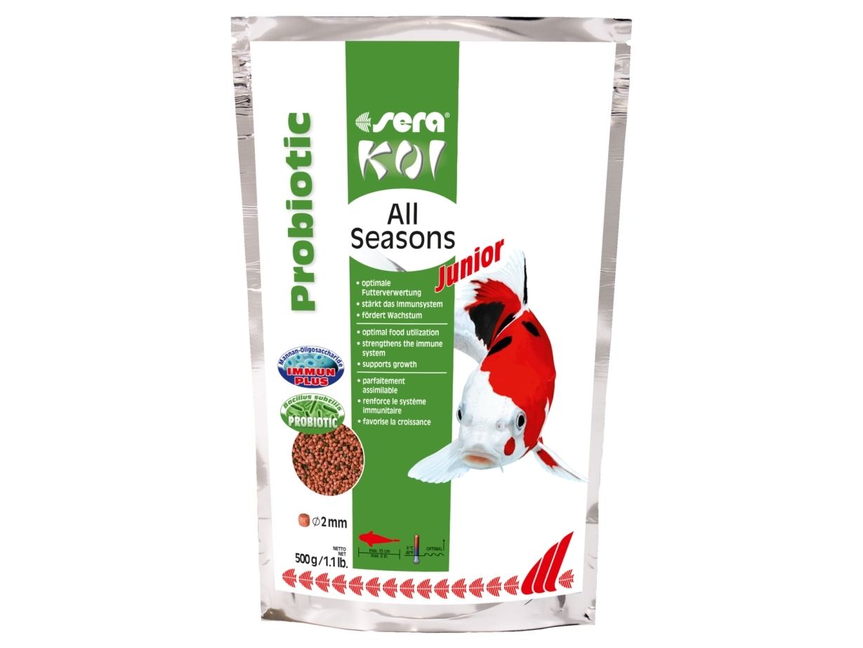 sera Koi Junior All Seasons Probiotic, Teichfische, Trockenfischfutter, Granulat, Vitamin A, Vitamin B1, Vitamin B2, Vitamin C, Vitamin D3, Vitamin E, Klein, 8 °C