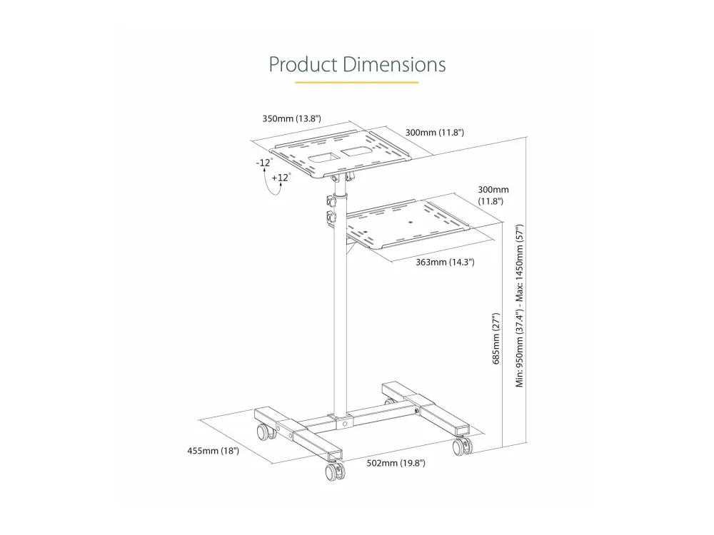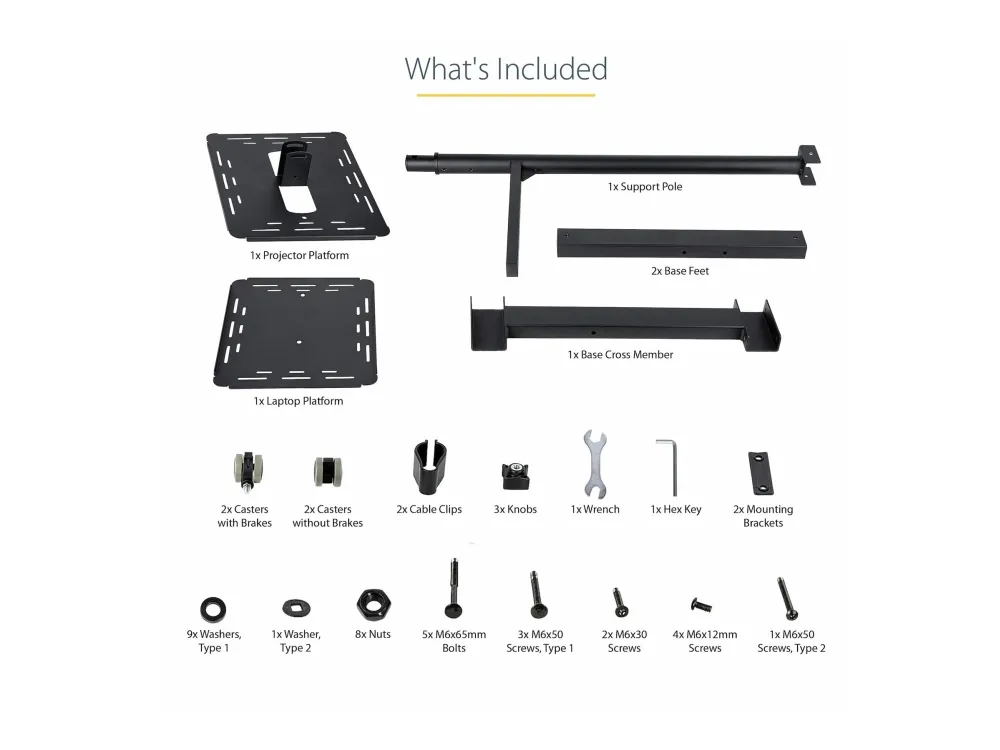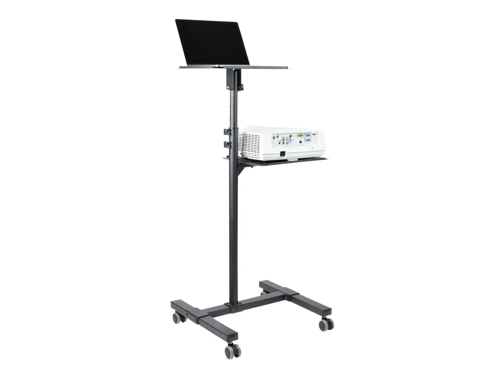This all-steel projector and laptop stand enables you to setup a mobile multimedia workstation that you can easily move between classrooms, boardrooms, and conference rooms. It has two device platforms that each support 22lb (10kg). This rolling cart is equipped with durable casters (2 lockable) that provide ease of transportation.