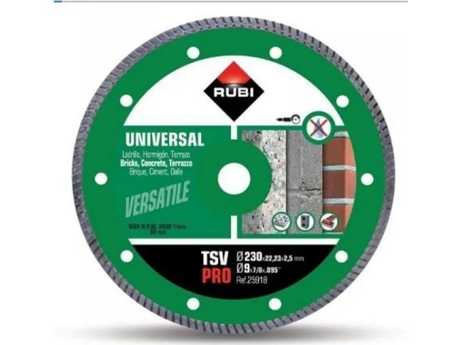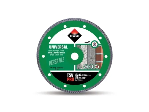Brand- Rubi. Model- TSV 230 . Diameter- 230 mm. Thickness- 2.5 mm. Number of Items- 1. Maximum speed per minute- 6650 rpm. Cutting speed- 80 m/s. Mandatory warranty- 24 mo. Warranty for legal entities- 36 mo.