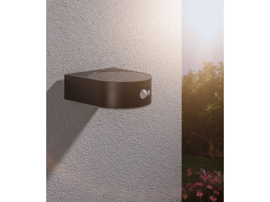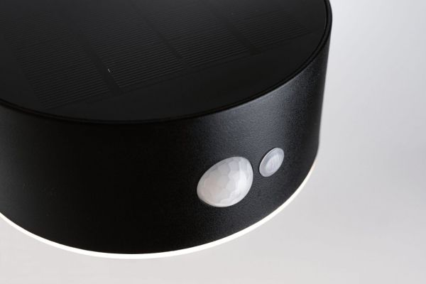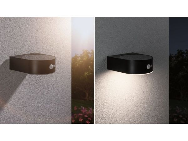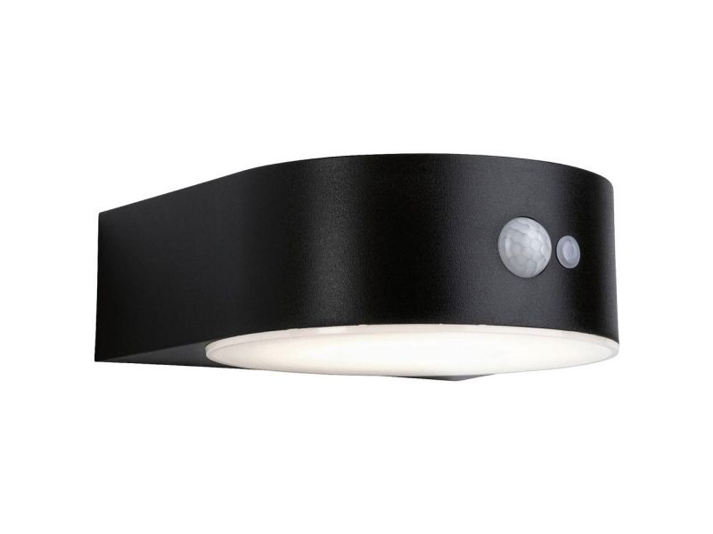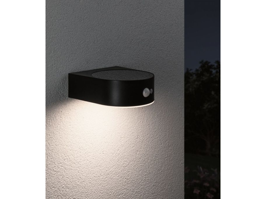 Solar LED Außenwandleuchte Solar Eileen Bewegungsmelder IP44 3000K 400lm Schwarz Die warmweiße Solarwandleuchte Eileen mit 400lm verbreitet angenehm flächiges Licht an Hauswänden und Eingangsbereichen. Dank praktischer Solartechnik kann sie unabhängig vom Stromanschluss platziert werden. Tagsüber wird der Akku durch das Sonnenlicht aufgeladen und dank des integrierten Bewegungsmelder in der Dunkelheit automatisch eingeschaltet, sobald sich jemand nähert. Solartechnik ist besonders umweltschonende und eine sparsame Alternative.