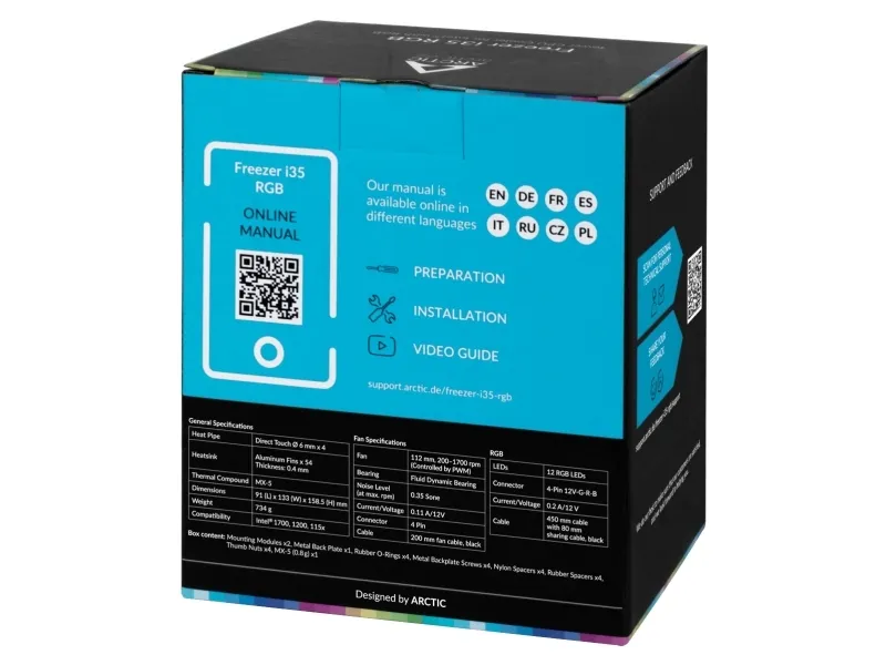 The Freezer i35 RGB is already compatible with Intel's Alder Lake LGA 1700 processors out of the box. Even though the socket has been enlarged compared to its predecessor, the hotspot remains centered in the CPU die area. The Direct Touch heatpipes of the Freezer i35 RGB completely cover this area.