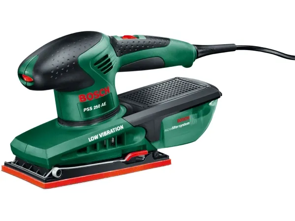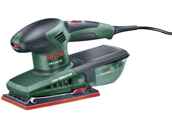 Rystepudser BOSCH PSS 250 AEKompakt rystepudser til en- og tohåndsbetjening · Mikrofiltersystem med gennemsigtig mikrofilterboks som niveauvisning · Bosch-Electronic med forvalg og styring af antal vibrationer i overensstemmelse med materialet · Slibeplade med mikroburrelukning i bedste kvalitet med 50% længere levetid · Vibrationsdæmpning · Softgrip · Kompakt design · Støvudsugning. · Med vibrationsdæmpning mikroburrelukningMed vibrationsdæmpningen arbejder du endnu mere komfortabelt og effektivt. Den integrerede støvudsugning med mikrofiltersystem med gennemsigtig mikrofilterboks som niveauvisning sørger for, at slibestøvet hurtigt fjernes fra emnet. Støvet fjernes effektivt, åndevejene belastes minimalt, og arbejdspladsen holdes ren. Endnu et pluspoint ved den nye rystepudser er slibepladen med mikroburrelukning af højeste kvalitet. Op til 50% længere levetid end de nuværende burrelukninger. Forbedret temperaturbestandighed, et mere sikkert og fast fæste er også givet efter længer